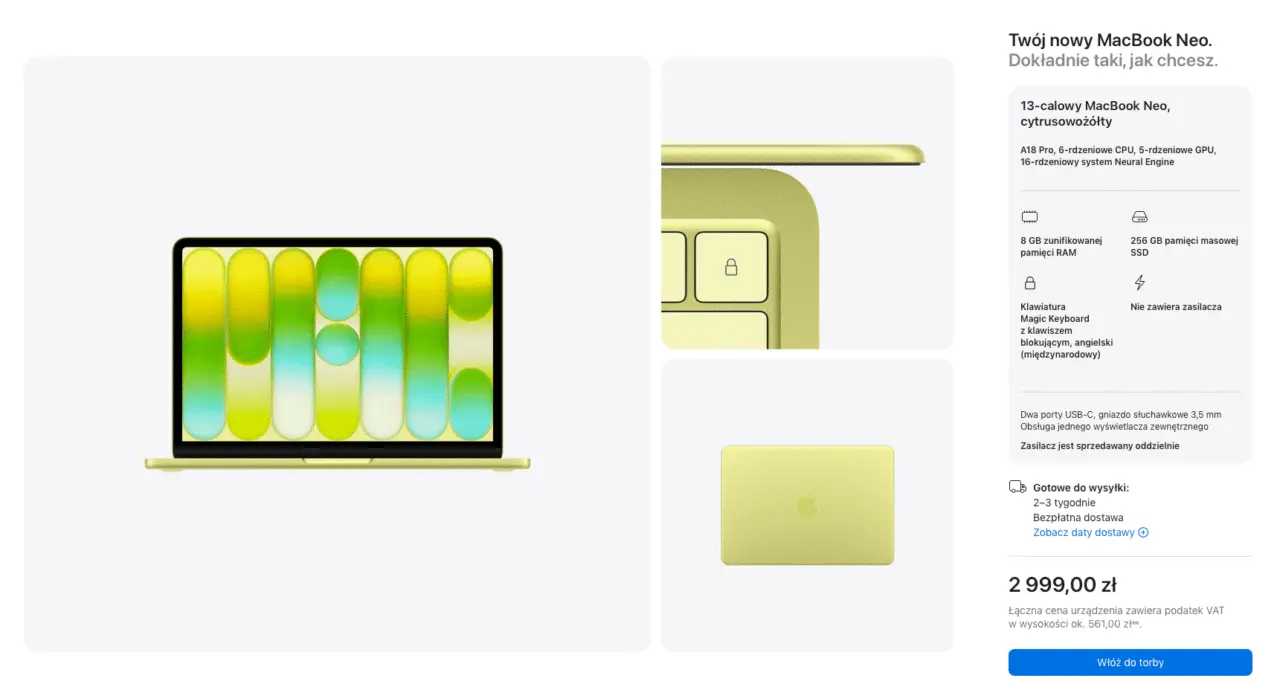Wyczerpujące się stany magazynowe dostrzegają także polscy konsumenci. MacBook Neo zamówiony przez główną stronę Apple dojdzie do klientów w przeciągu najbliższych 2, 3 lub 4 tygodni. Do niedawna czas oczekiwania wynosił maksymalnie kilka dni.