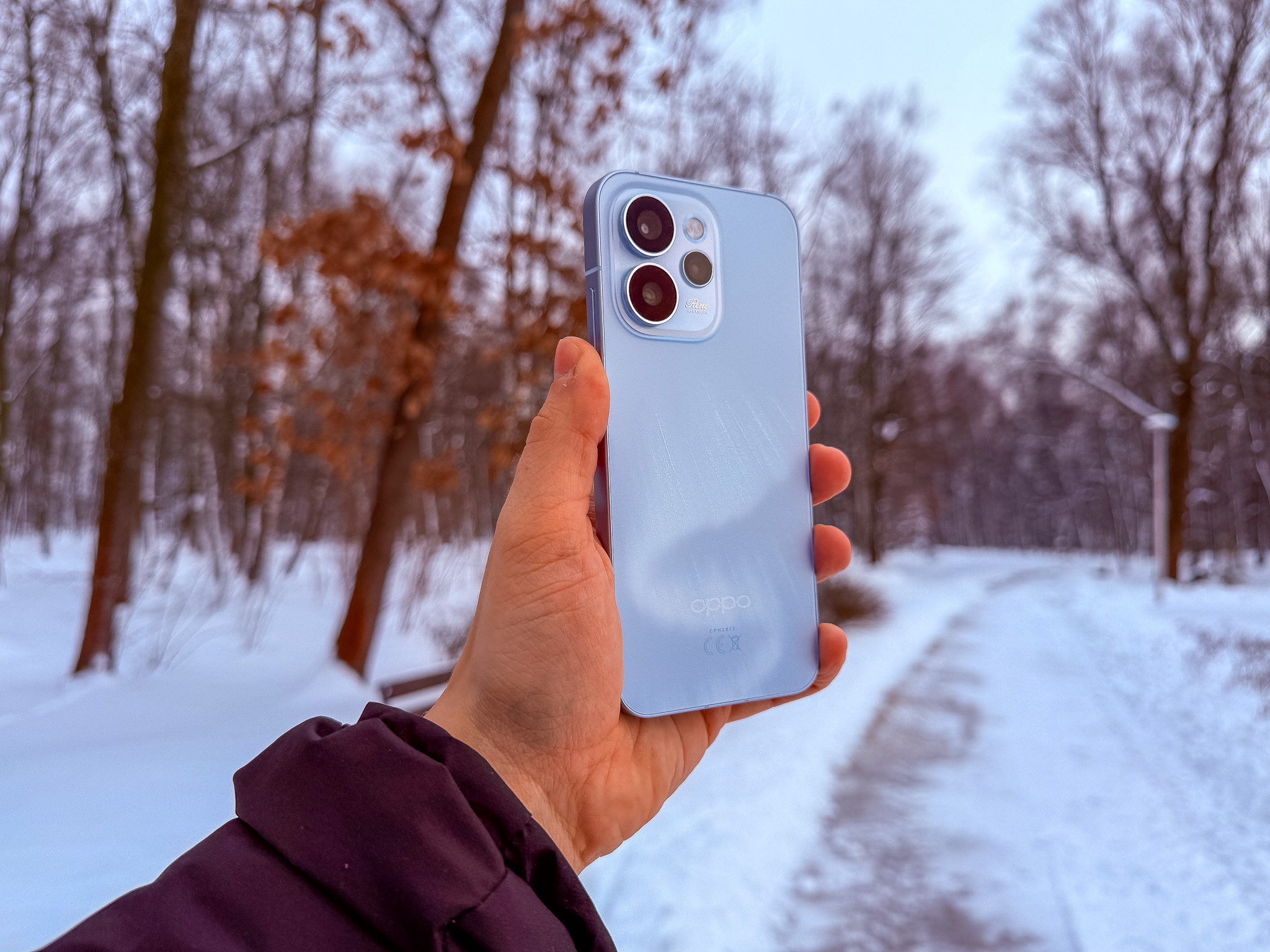 Podczas gdy konkurencja stawia na jednolity blok koloru, Oppo bawi się strukturą. Kiedy światło pada na ten telefon, za każdym razem wygląda on inaczej. W pełnym słońcu obudowa mieni się chłodnym błękitem przechodzącym w subtelny fiolet, a wieczorem nabiera głębszych tonów. Kolory nie mają ostrych granic.