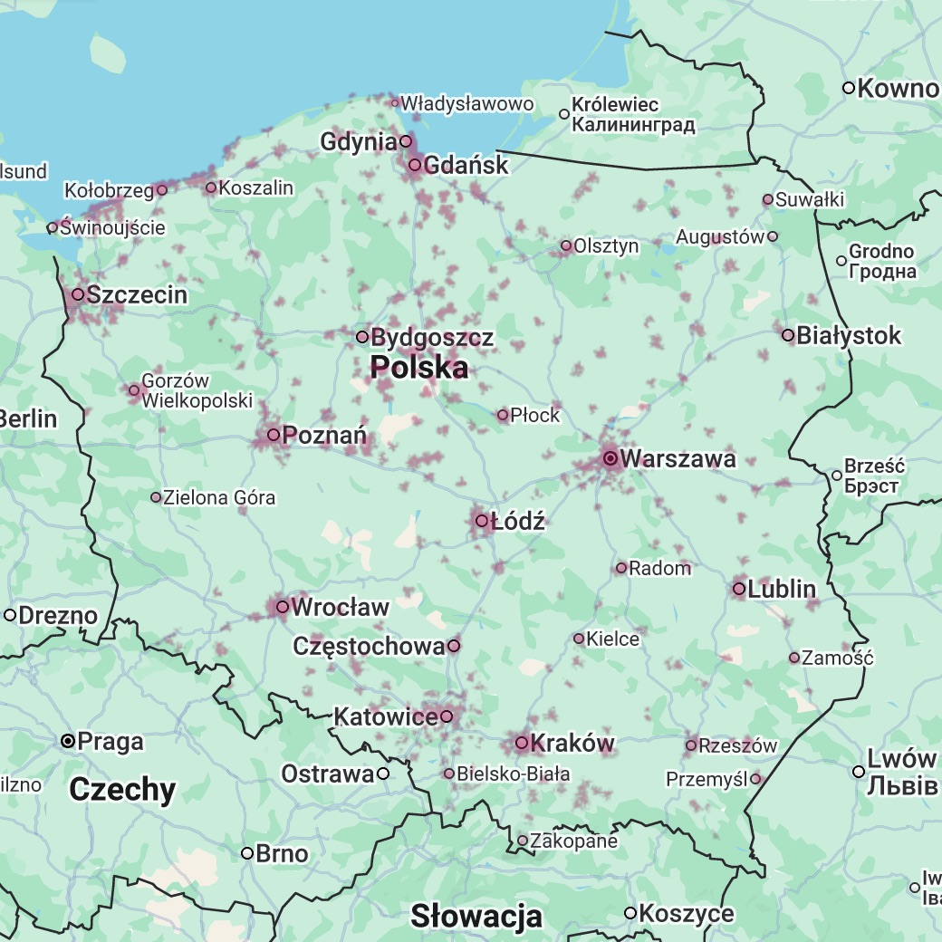 Aktualna mapa zasięgu T-Mobile Polska, 5G (zrzut ekranu: 9 stycznia 2026 r.)Zasięg sieci 5. generacji w T-Mobile dociera do wielu regionów Polski. Nie dotyczy to wyłącznie najludniejszych aglomeracji takich jak stolica z okolicami, Zagłębie Śląskie lub Trójmiasto. Z szybkiego internetu mogą skorzystać mieszkańcy również tych mniejszych miast i miejscowości.