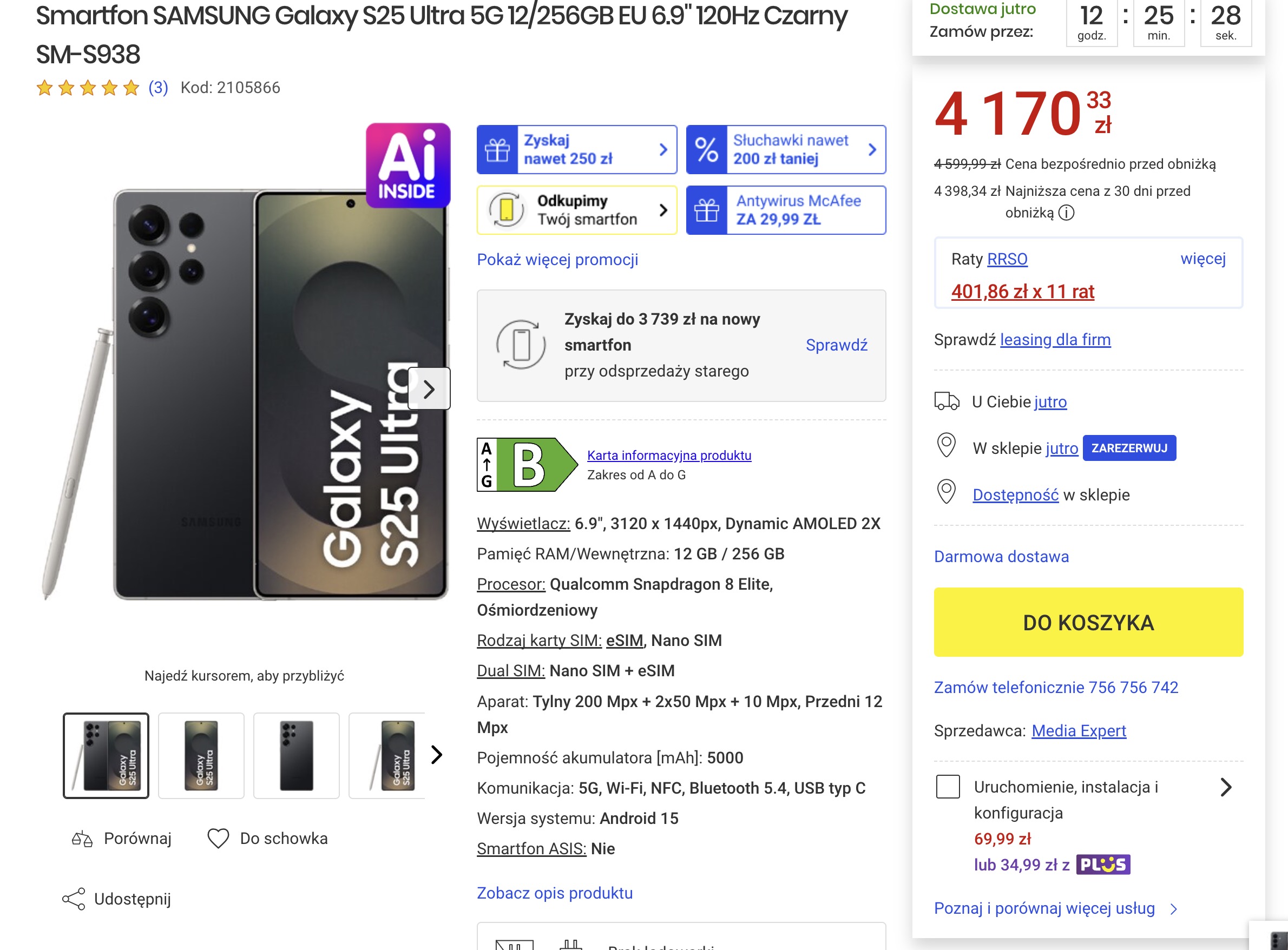 Promocja dotyczy Galaxy S25 Ultra w wersji 12/256 GB z czarnym wykończeniem. telefon w tej chwili kosztuje 4170 zł, a cena bezpośrednio przed obniżką wynosiła 4599 zł. Mówimy zatem o różnicy na poziomie 330 zł. Czemu jest tak tanio i gdzie jest haczyk?