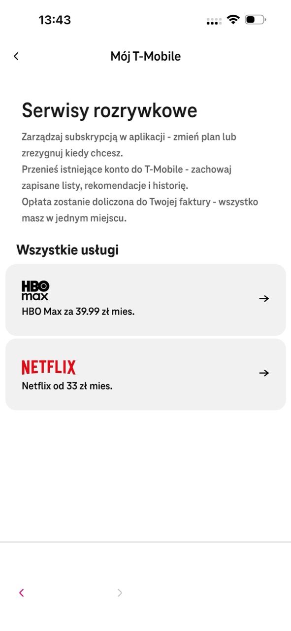 Opcja dotyczy usługi Netflix, która jest oferowana bezpośrednio przez T-Mobile – każdy numer abonenta ma przypisaną dedykowaną ofertę. Nie dotyczy zatem subskrypcji realizowanej przez Netflixa. Opłata za dostęp do serwisu VOD jest doliczana do rachunku za usługi T-Mobile oraz co najważniejsze – to opcja bez zobowiązań. Czyli tak, jak gdybyśmy podłączyli kartę płatniczą bezpośrednio do Netflixa.