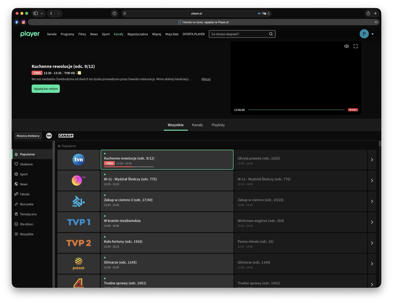 Dostęp do telewizji przez internet zapewnia również player.pl, czyli serwis stworzony przez stację TVN, który wymaga założenia konta, by oglądać dostępne tu treści. Jakie kanały można oglądać tutaj bezpłatnie? Na liście znalazły się TVP1, TVP2, TVP3, TTV, Metro HD, TV Puls, TV 4 oraz Polsat, a także liczne kanały tematyczne TVN: