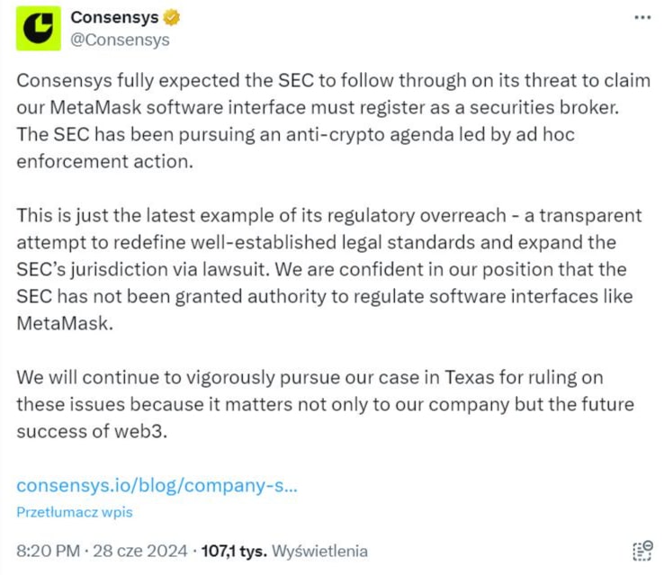 Na reakcję strony pozwanej nie trzeba było długo czekać. „Consensys w pełni spodziewał się, iż SEC zrealizuje swoją groźbę, twierdząc, iż nasz interfejs systemu MetaMask musi zarejestrować się jako makler papierów wartościowych. SEC realizuje agendę antykryptowalutową prowadzoną przez doraźne działania egzekucyjne. To tylko najnowszy przykład jej nadmiernego zasięgu regulacyjnego – przejrzysta próba przedefiniowania ugruntowanych standardów prawnych i rozszerzenia jurysdykcji SEC poprzez pozew sądowy. Jesteśmy pewni naszego stanowiska, iż SEC nie otrzymała uprawnień do regulowania interfejsów oprogramowania, takich jak MetaMask. Będziemy przez cały czas energicznie prowadzić naszą sprawę w Teksasie, aby uzyskać orzeczenie w tych kwestiach, ponieważ ma to znaczenie nie tylko dla naszej firmy, ale także dla przyszłego sukcesu web3” – napisano w poście na X.