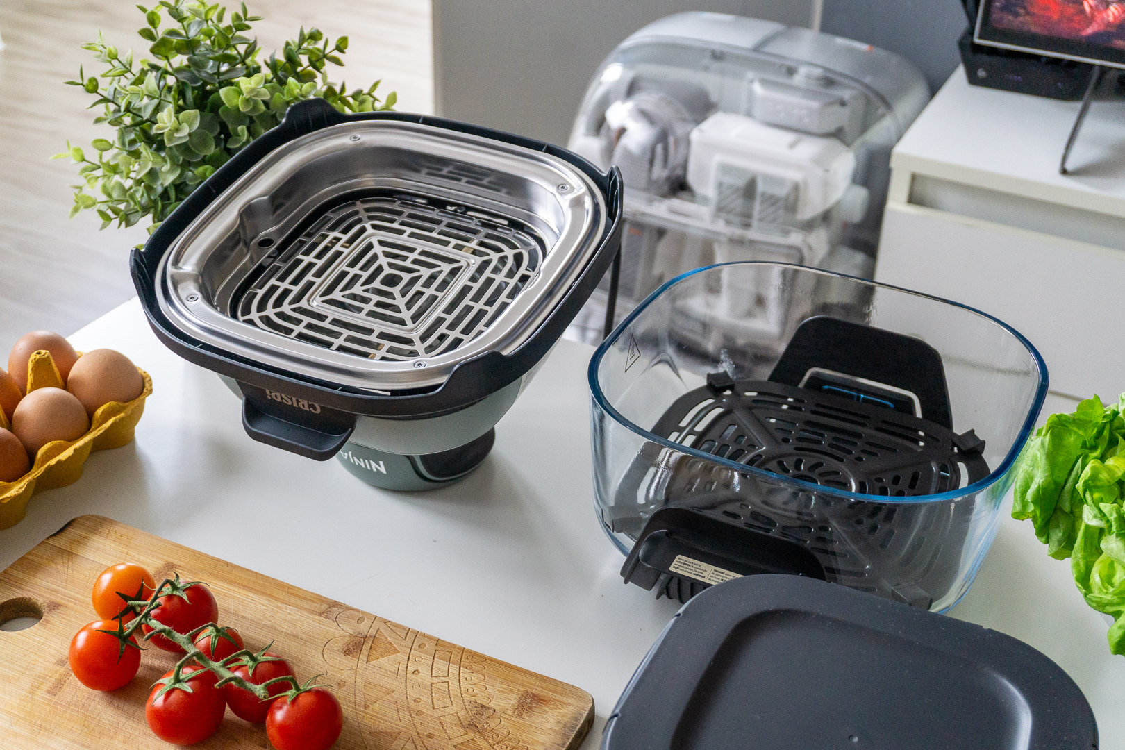 W zestawie Ninja CRISPi znajdują się trzy główne elementy: pokrywa grzewcza z kablem oraz interfejsem sterującym, duże naczynie żaroodporne oraz małe naczynie żaroodporne. Air fryer działa w taki sposób, iż pokrywę nakładamy na wybraną szklaną misę, podłączamy do prądu, wybieramy program i pieczemy bez tłuszczu. Trochę jak gotowanie w garnku, tylko z ciepłem od góry, nie od spodu.