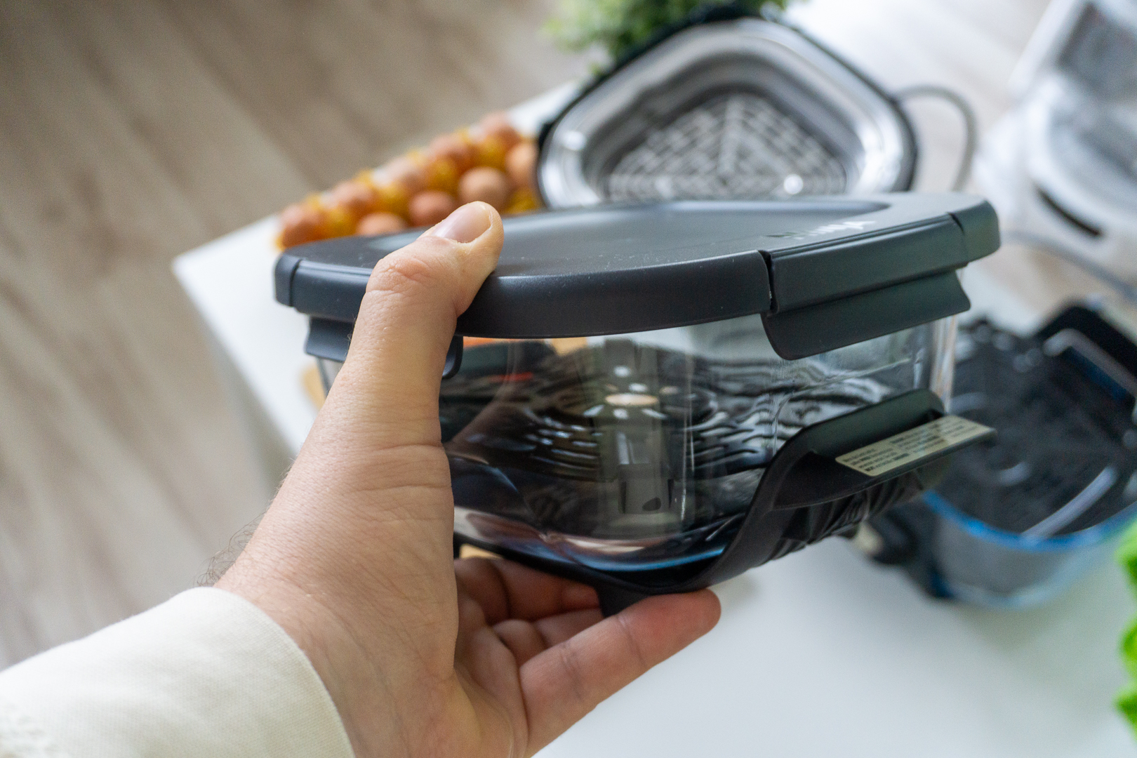 Teraz najlepsze: naczynia żaroodporne to samodzielne elementy, z własnymi pokrywami oraz ochronnymi uchwytami i podstawami. To daje gigantyczne możliwości. Po pierwsze, nie musimy wykładać jedzenia na talerz albo do misy, chcąc przenieść je na stół w jadalni. Po drugie, takie naczynie możemy przykryć dodatkową pokrywą (nie tą z kablem) z zestawu i zabrać np. do pracy. Albo na siłownię.