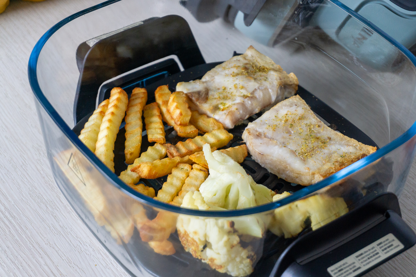 Co mamy zamiast ustawiania temperatury? Cztery tryby: keep warm, recrisp, roast oraz air fry, o rosnącej temperaturze. Zgaduję, iż maksymalny tryb o nazwie air fry działa w 180 – 200 stopniach. Na więcej raczej nie pozwala przenośny układ urządzenia oraz moc wynosząca 1700W. jeżeli macie przepisy w 240 stopniach – ta maszyna raczej sobie z nimi nie poradzi.