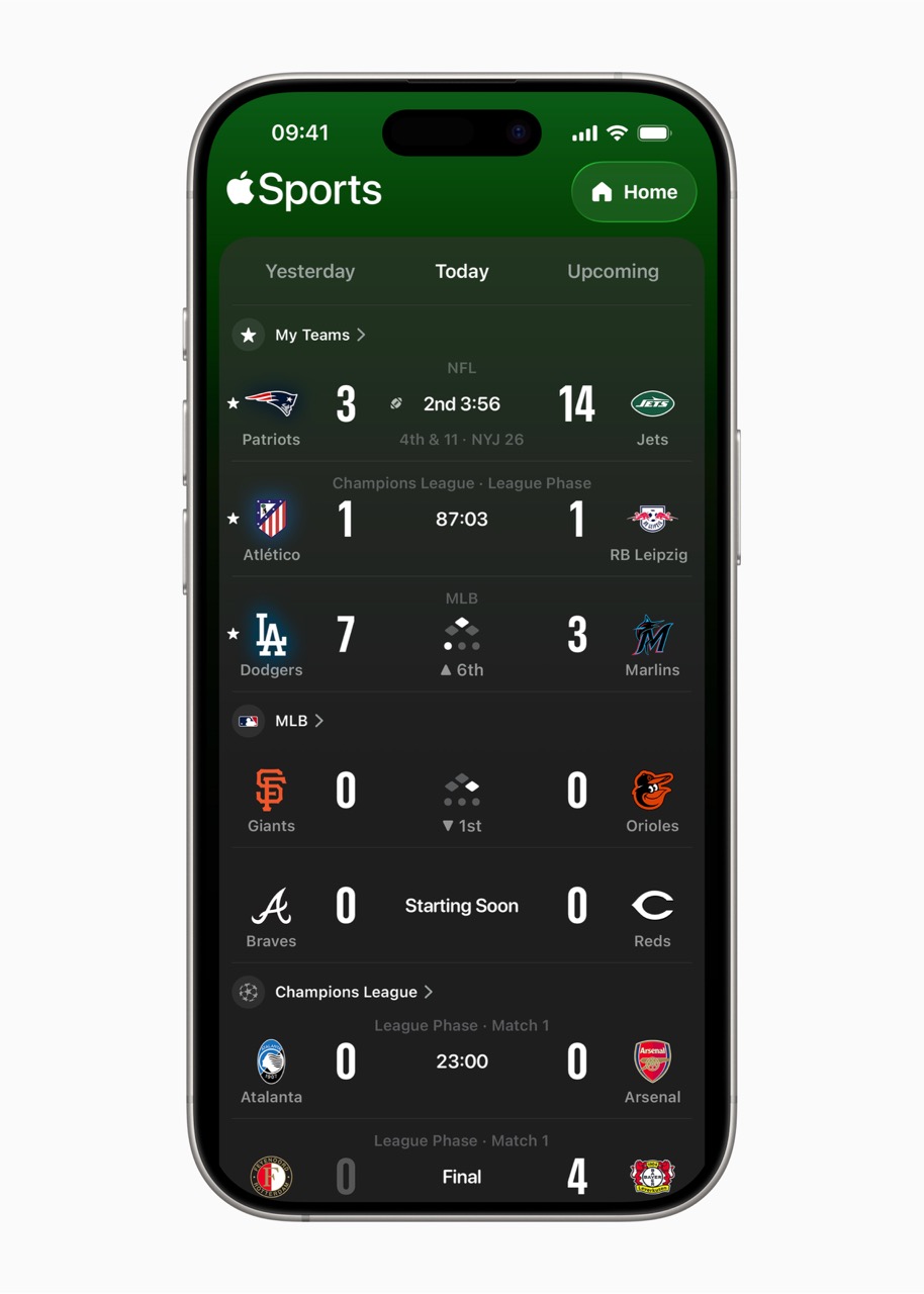 Główny ekran w Apple Sports składa się z kilku sekcji, a najważniejsza z nich prezentuje wyniki meczy – czy to naszych ulubionych drużyn, czy to z wybranych lig. Domyślny widok pokazuje spotkania odbywające się dziś, ale można przewinąć ekran w lewo, by sprawdzić wyniki wczorajszych meczy, lub w prawo, aby sprawdzić, jakie drużyny będą się mierzyć ze sobą w najbliższym czasie.