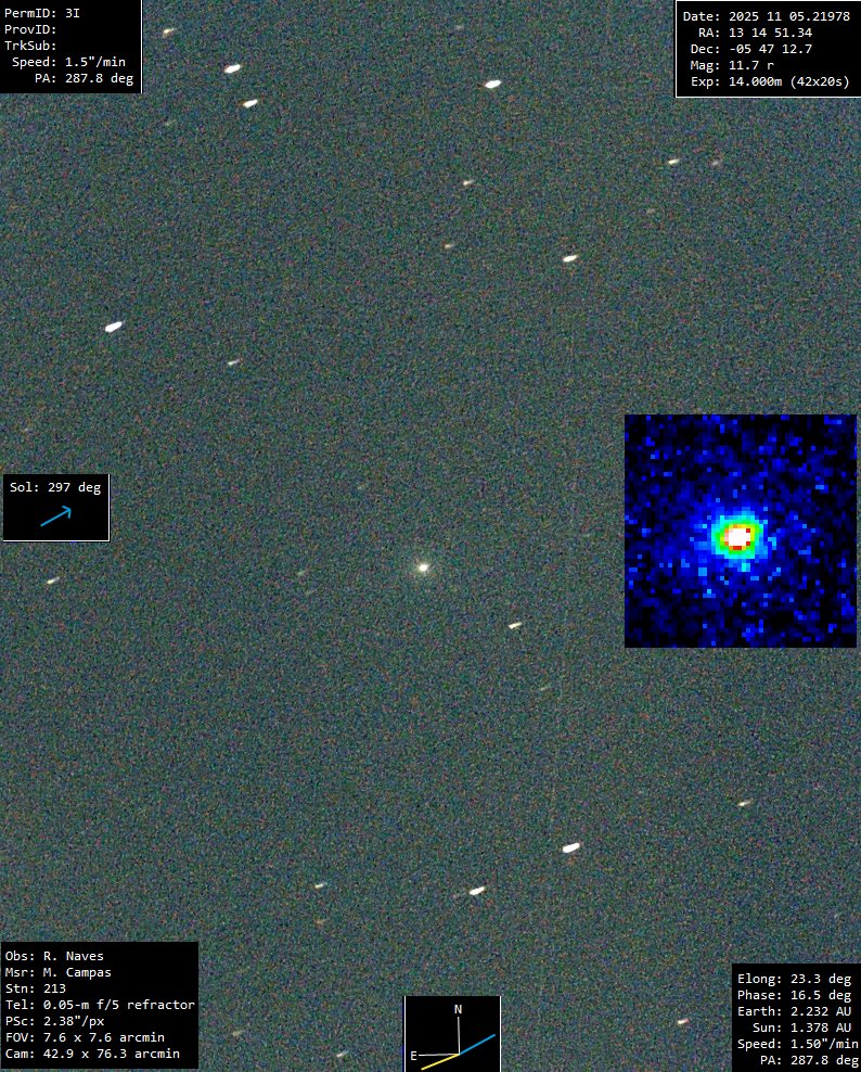 Główna ilustracja: Najnowsze zdjęcie obiektu międzygwiazdowego 3I/Atlas po przejściu peryhelium, wykonane 5 listopada 2025 r. przez Obserwatorium R. Navesa, przedstawia rozmytą kulę światła. Nie widać wyraźnego warkocza komety. Źródło: Obserwatorium R. Navesa, Hiszpania