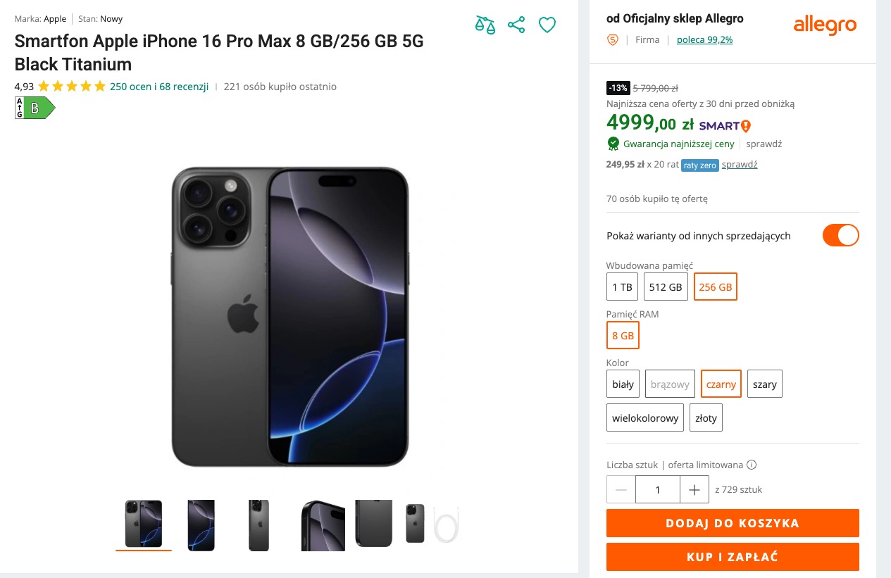 Na Allegro znajdziemy iPhone’a 16 Pro Max w wersji 256 GB za 4999 zł. telefon nie jest już dostępny w regularnej sprzedaży, dlatego sklepy wyprzedają ostatnie sztuki magazynowe.