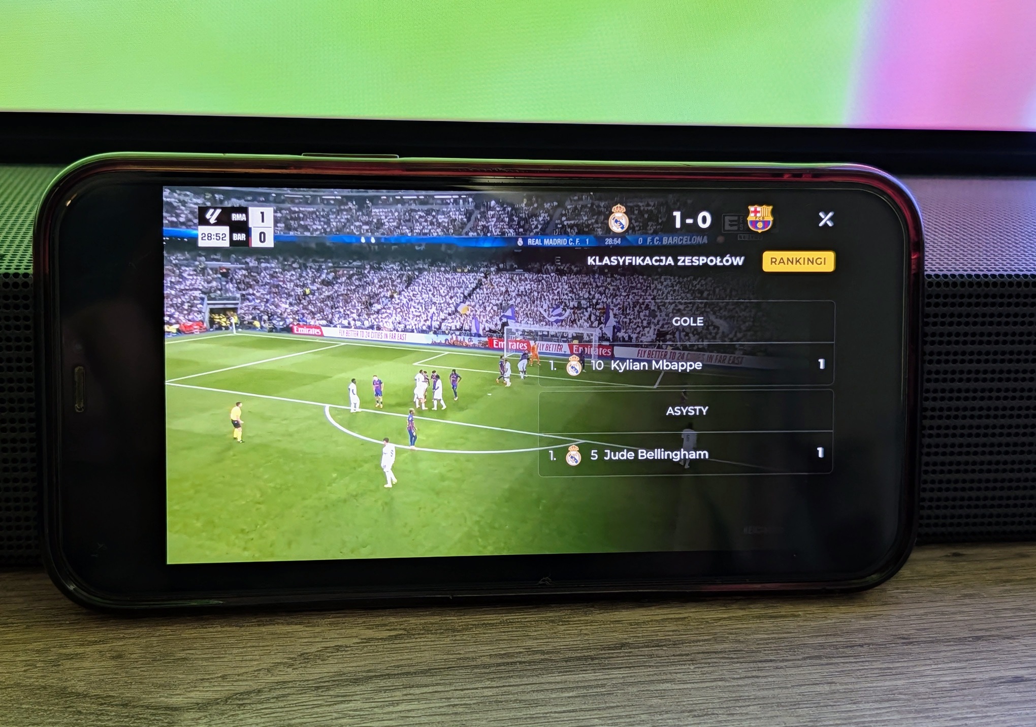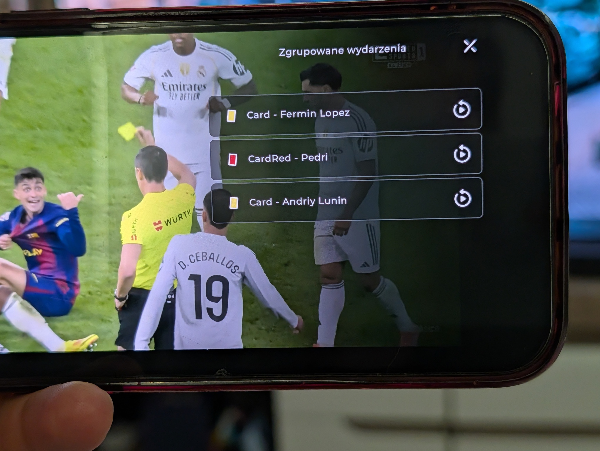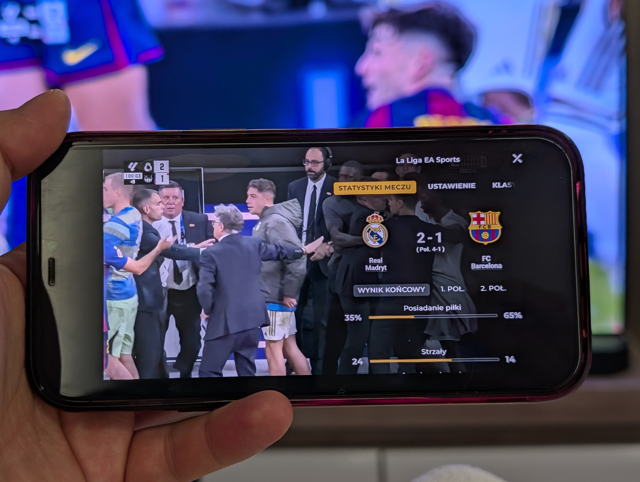 Transmisja w ramach Polsat Box Go ma kilka plusów, a jednym z nich jest możliwość błyskawicznego powrotu do powtórki wybranej akcji. Na pasku postępu meczu zaznaczone są najważniejsze momenty, więc bez trudu mogłem cofnąć się do najważniejszych wydarzeń El Clasico. Gdy kibice na stadionie zamarli w milczeniu w oczekiwaniu na VAR weryfikujący potencjalnego karnego na Viniciusie Juniorze, to ja już wiedziałem, iż nic z tego, bo mogłem sobie obejrzeć wybraną akcję kilka razy z rzędu. Od razu wyłapałem, iż tam najpierw był faul na Yamalu, więc Real musi obejść się smakiem.
