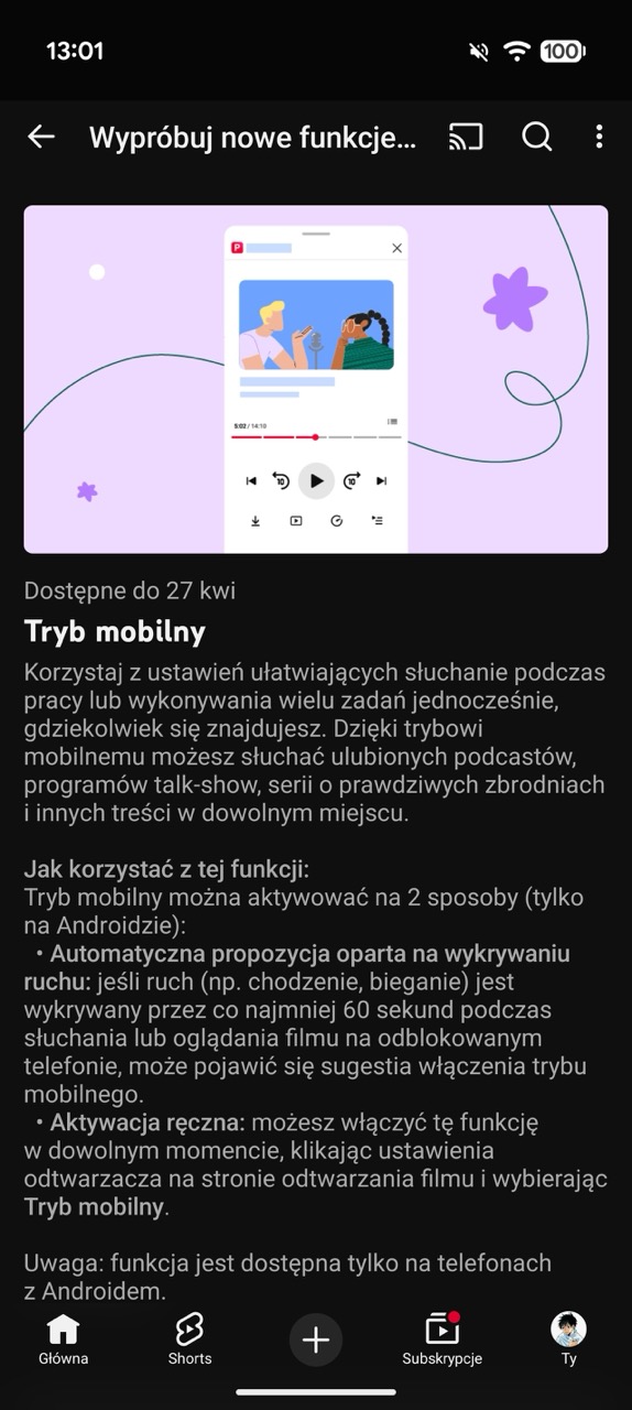 YouTube Premium daje dostęp do innej funkcji: trybu mobilnego. To ustawienia ułatwiające słuchanie podczas pracy lub wykonywaniu wielu zadań. Rozwiązanie aktywuje się w momencie słuchania lub oglądania filmu na odblokowanym telefonie całkowicie automatycznie, o ile wykryje ruch przez co najmniej 60 sekund. Można też włączyć je manualnie na stronie odtwarzania filmu, wybierając Tryb mobilny. Opcja ma być dostępna wyłącznie na Androidzie, a przynajmniej na początku.