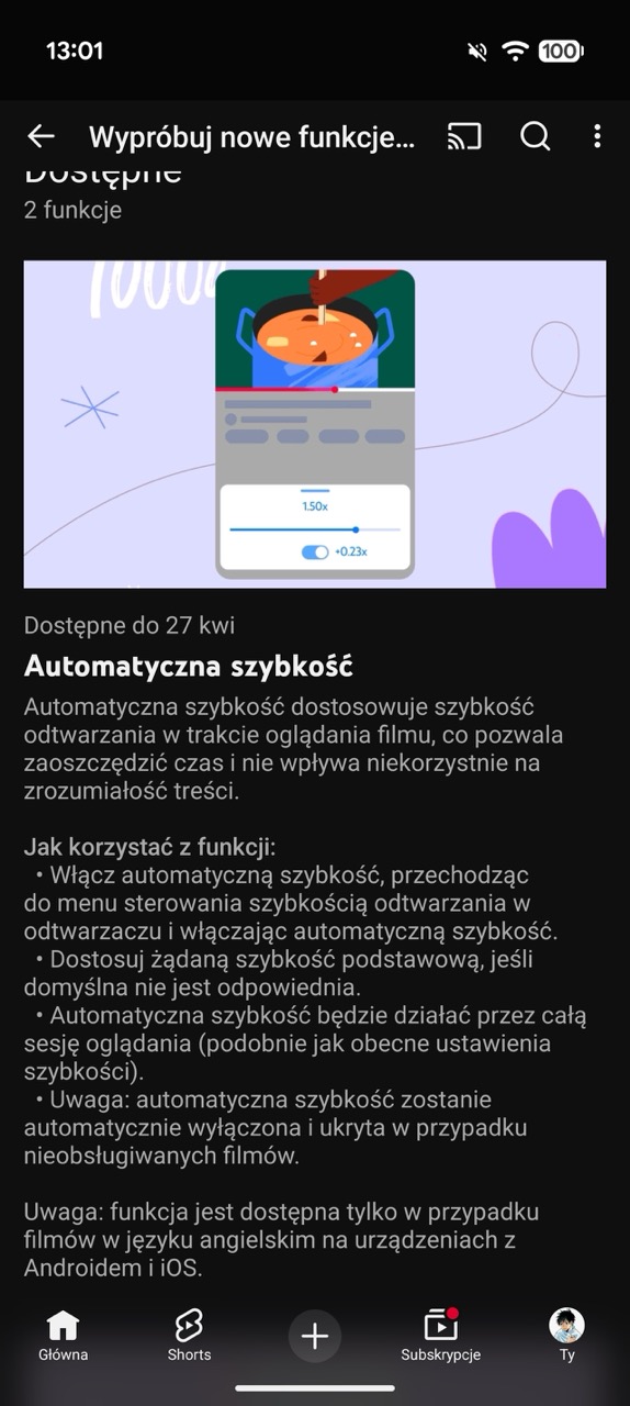 Tym sposobem rozwiązanie ma oszczędzić trochę czasu użytkownikowi. Automatyczna szybkość ma działać przez całą sesję oglądania, a w nieobsługiwanych filmach zostanie automatycznie wyłączona. Rozwiązanie początkowo ma być dostępne w j. angielskim na obu platformach: Android oraz iOS, ale z czasem powinno zostać rozszerzone do większej liczby języków. Opcja będzie dostępna tylko dla tych, którzy płacą za abonament YouTube Premium kosztujący 29,99 zł/mies.