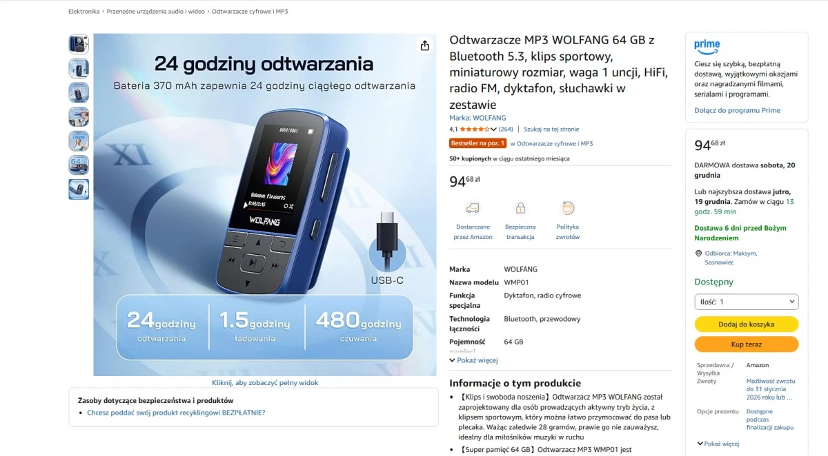 Grafika: Instalki.pl – zrzut ekranu z Amazon.plProducent obiecuje dźwięk wysokiej jakości (Hi-Fi), realizowany bezprzewodowo poprzez Bluetooth 5.3 i zachwala obecność radia FM. Odtwarzacz MP3 Wolfang obsługuje wszystkie popularne formaty muzyczne, jak MP3, FLAC, WAV i APE. Są tu choćby opcje robienia niskiej jakości zdjęć, rejestrowania dźwięku i licznik kroków. Dla niektórych potencjalnie zainteresowanych niemałym atutem będzie aż 10 lat bezpłatnej konserwacji i dożywotnie wsparcie techniczne.