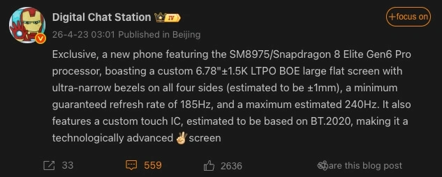 fot. DCS, WeiboSam ekran ma oferować płynność odświeżania na poziomie od 185 Hz do aż 240 Hz. To zauważalny wzrost względem modelu OnePlus 15, który dysponował panelem 165 Hz. Dodatkowo wsparcie dla gamy kolorów BT.2020 sugeruje, iż jakość odwzorowania kolorów zadowoli najbardziej wymagających użytkowników.