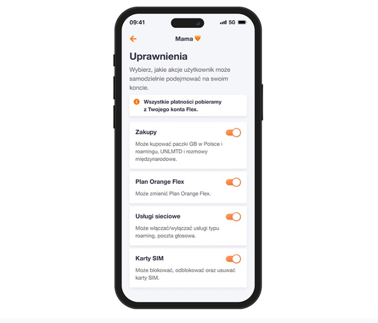Druga sprawa to, iż zarządzający dodatkowymi numerami mają większą kontrolę nad uprawnieniami innych kont. Można zaznaczyć, czy osoba z rodziny będzie w stanie samodzielnie kupować paczki GB w Polsce i roamingu, pakiety nielimitowane czy rozmowy międzynarodowe. Jest też możliwość pozwolenia zmiany planu Orange Flex, czy zarządzania kartami SIM: usuwania, blokowania, odblokowywania oraz wyłączania lub włączania innych usług sieciowych.