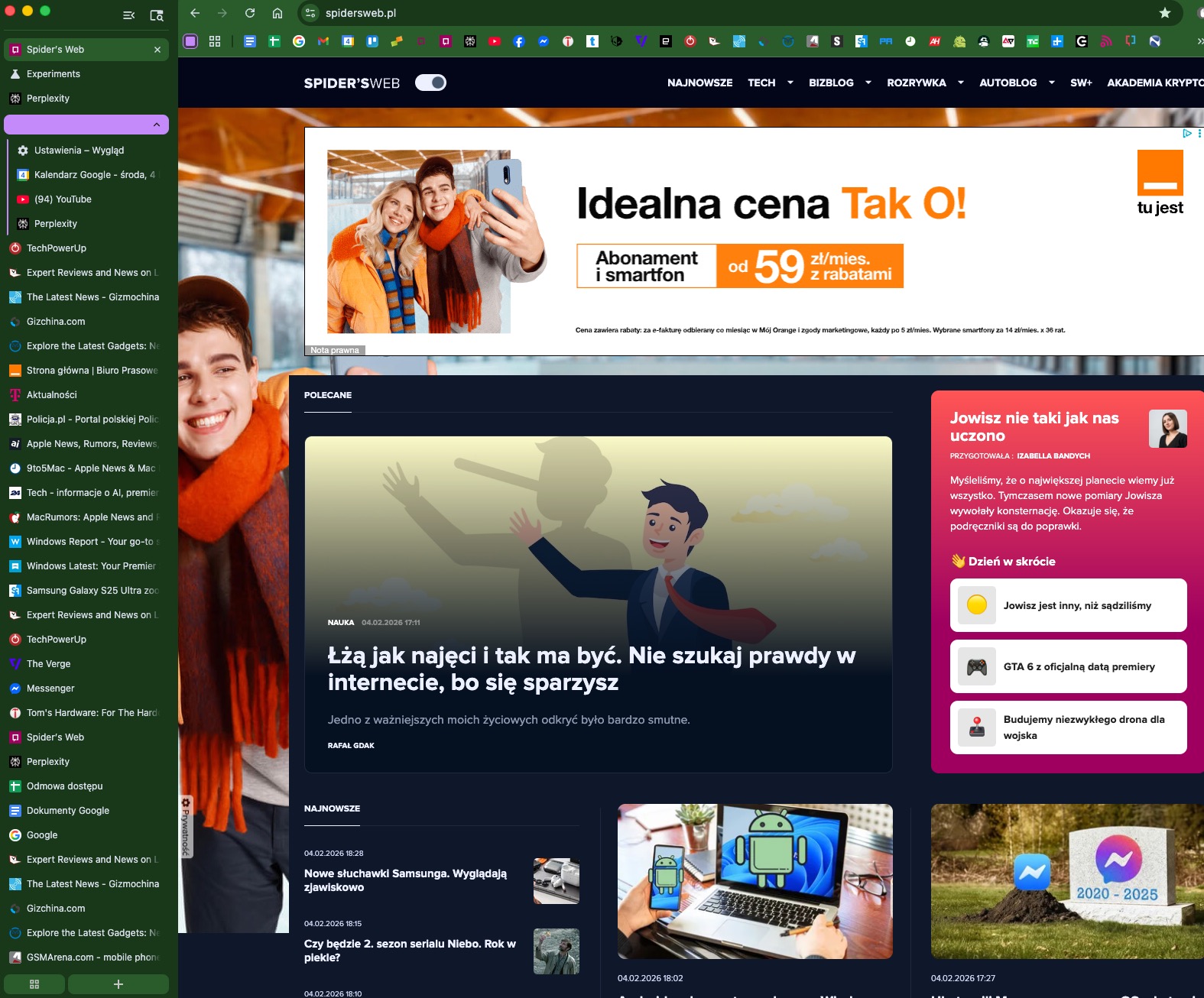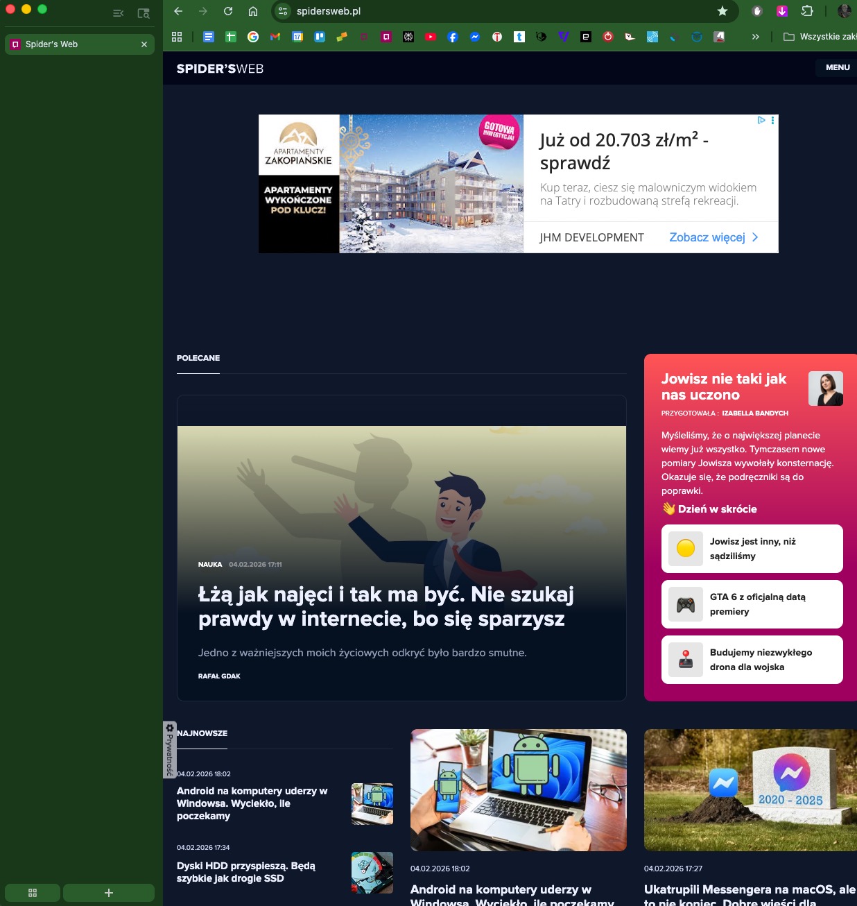 Zauważyłem też inną ciekawą kwestię, która przynajmniej na początku może sprawiać trudności z przyzwyczajeniem się. Mianowicie gdy pasek kart jest zwinięty każde kliknięcie miniaturki karty powoduje zamknięcie strony. Nie wiem, kto to projektował, ale w moim odczuciu tak nie powinno to działać. Druga sprawa to niespójność kolorystyczna paska bocznego, który zachodzi na pasek zakładek. W wersji na macOS wygląda to źle.