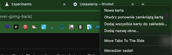 Tym sposobem otrzymamy opcję aktywowania pionowych kart w przeglądarce. Aby zmienić ustawienie orientacji kart należy kliknąć prawym przyciskiem myszy na pole tuż obok kart i wybrać opcję Move Tabs to The Side. Alternatywnie można też znaleźć opcję w ustawieniach przeglądarki przechodząc do Ustawienia > Wygląd > Pozycja paska kart > Strona.