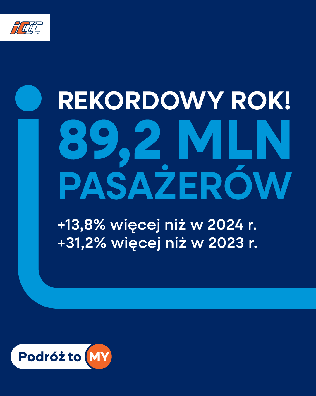 We wrześniu z usług PKP Intercity skorzystało 7,3 mln osób, co oznacza wzrost o 17 proc. rok do roku. Październik przyniósł 8 mln pasażerów – aż o 27 proc. więcej niż rok wcześniej, a w listopadzie pociągami przewoźnika podróżowało 7,6 mln osób (wzrost o 23 proc.). Grudzień zakończył rok wynikiem 7,8 mln pasażerów, czyli o ponad 19 proc. więcej niż w 2024 roku – podsumowuje PKP Intercity.