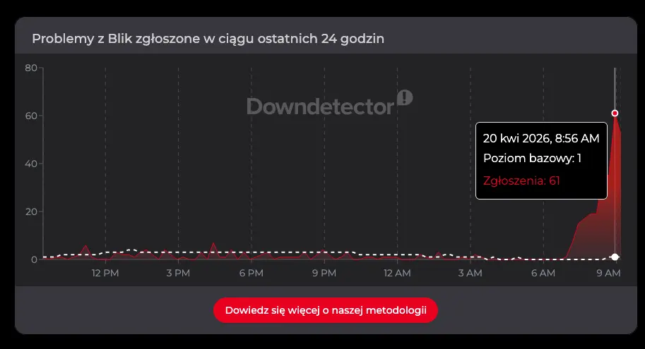 Około godziny 9:00 w serwisie Downdetector odnotowano 61 zgłoszeń problemów z Blikiem, 338 dotyczących Visy oraz 43 związane z Mastercard.