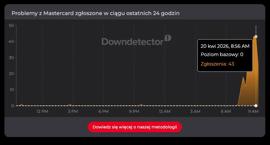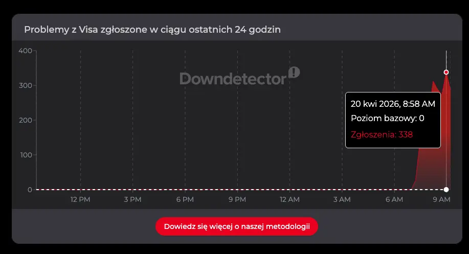 Dane z serwisu monitorującego awarie wskazują, iż pierwsze sygnały o problemach pojawiły się jeszcze przed godziną 8:00. O 7:54 odnotowano 209 zgłoszeń dotyczących działania Visa, a już kilkanaście minut później liczba ta wyraźnie wzrosła. W szczytowym momencie około 8:15 było już prawie 300 raportów. W międzyczasie zaczęły pojawiać się także zgłoszenia związane z innymi operatorami – o 8:01 użytkownicy zgłosili 19 przypadków problemów z Mastercard, a o 8:02 odnotowano 25 raportów dotyczących Blika. Potem te liczby tylko rosły.