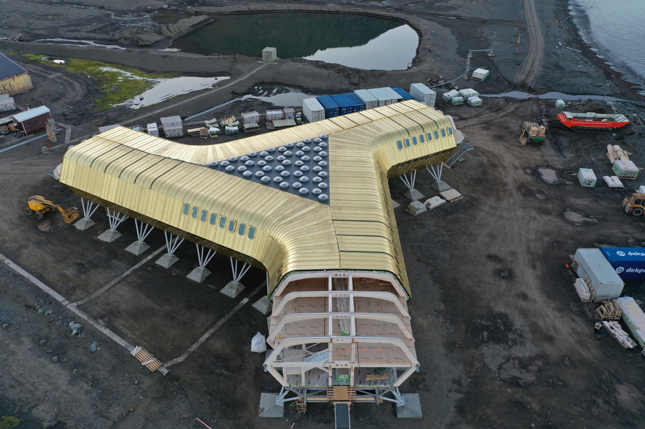 Budowa Polskiej Stacji Antarktycznej im. Henryka Arctowskiego. Nowy budynek zyskał już ogromną ilość paneli, a w tej chwili montowane są trzy ostatnie ramy jego drewnianej konstrukcji. Ekipa dekarzy pracuje nad uszczelnianiem połączeń paneli, by jak najszybciej uzyskał on całkowitą szczelność. Równolegle realizowane są intensywne prace wewnątrz. Montowane są ścianki działowe oraz stolarka drzwiowa. Większość pomieszczeń zyskała już swoje kształty, a w niektórych świeci już światło! – czytamy na facebookowym profilu Polskiej Stacji Antarktycznej im. Henryka Arctowskiego.