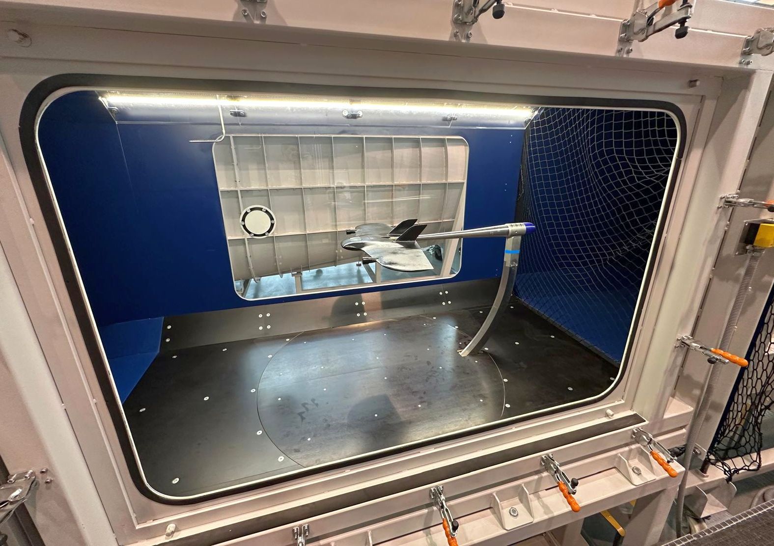 SkyRes, czyli bezzałogowy system szybkiego reagowania dostarczający defibrylator AED. Na zdjęciu widzimy model w czasie testów w tunelu aerodynamicznym. Fot PWrParametry tego sprzętu robią doskonałe wrażenie. SkyRes jest w stanie przenieść ładunek o masie do 3,5 kg, w tym defibrylator AED oraz niezbędny sprzęt ratunkowy, na dystansie sięgającym 10 km. Prędkość przelotowa wynosi 160 km/h, pułap to 2000 m. Dron zbudowany jest z kompozytu węglowo-epoksydowego, a napęd stanowią dwa silniki elektryczne.