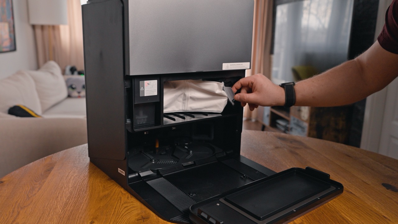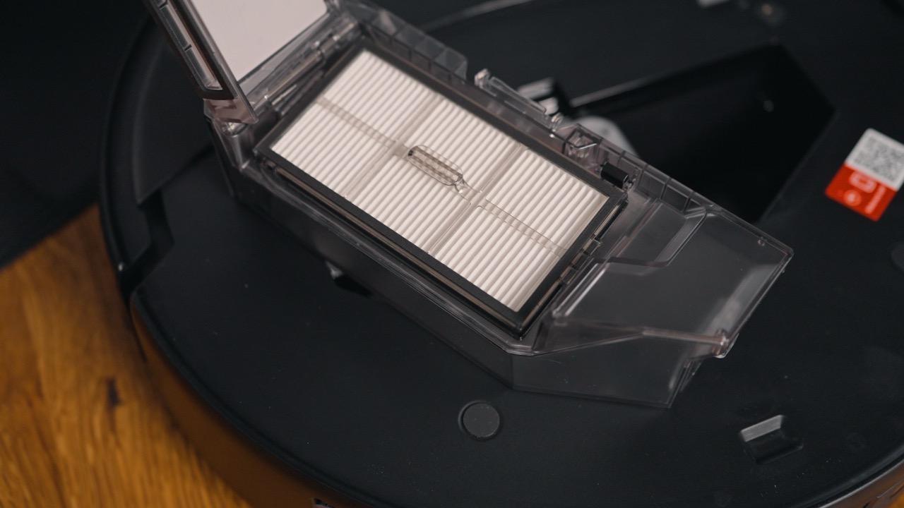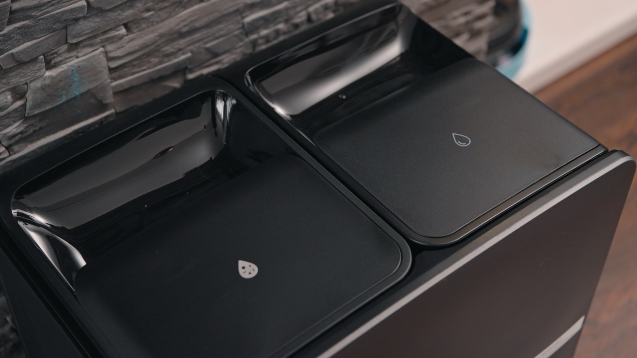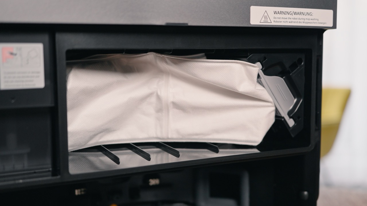 Pod zdejmowaną pokrywą przednią przyczepianą na magnesy znajduje się miejsce na pojemnik z detergentem, który może być dozowany, aby usprawnić proces mopowania oraz worek na kurz. To właśnie do tego worka zasysane są wszelkie nieczystości, jakie robot zebrał w pojemniku podczas pracy. Na górze z kolei znalazły się dwa pojemniki na wodę: czystą oraz brudną.