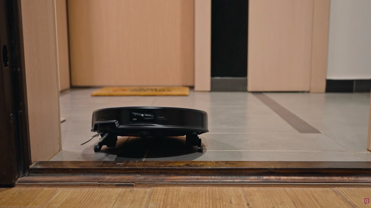 Sam co prawda w mieszkaniu progów nie mam, ale w ramach testu pozwoliłem robotowi wyjechać na klatkę schodową. Droga na nią prowadzi przez mierzący nieco ponad 4 cm próg, z którym Saros 20 sobie, rzecz jasna, poradził. I nic dziwnego – wedle specyfikacji urządzenie jest w stanie pokonywać progi dwustopniowe o wielkości kolejno do 4,5 cm oraz do 4,3 cm.