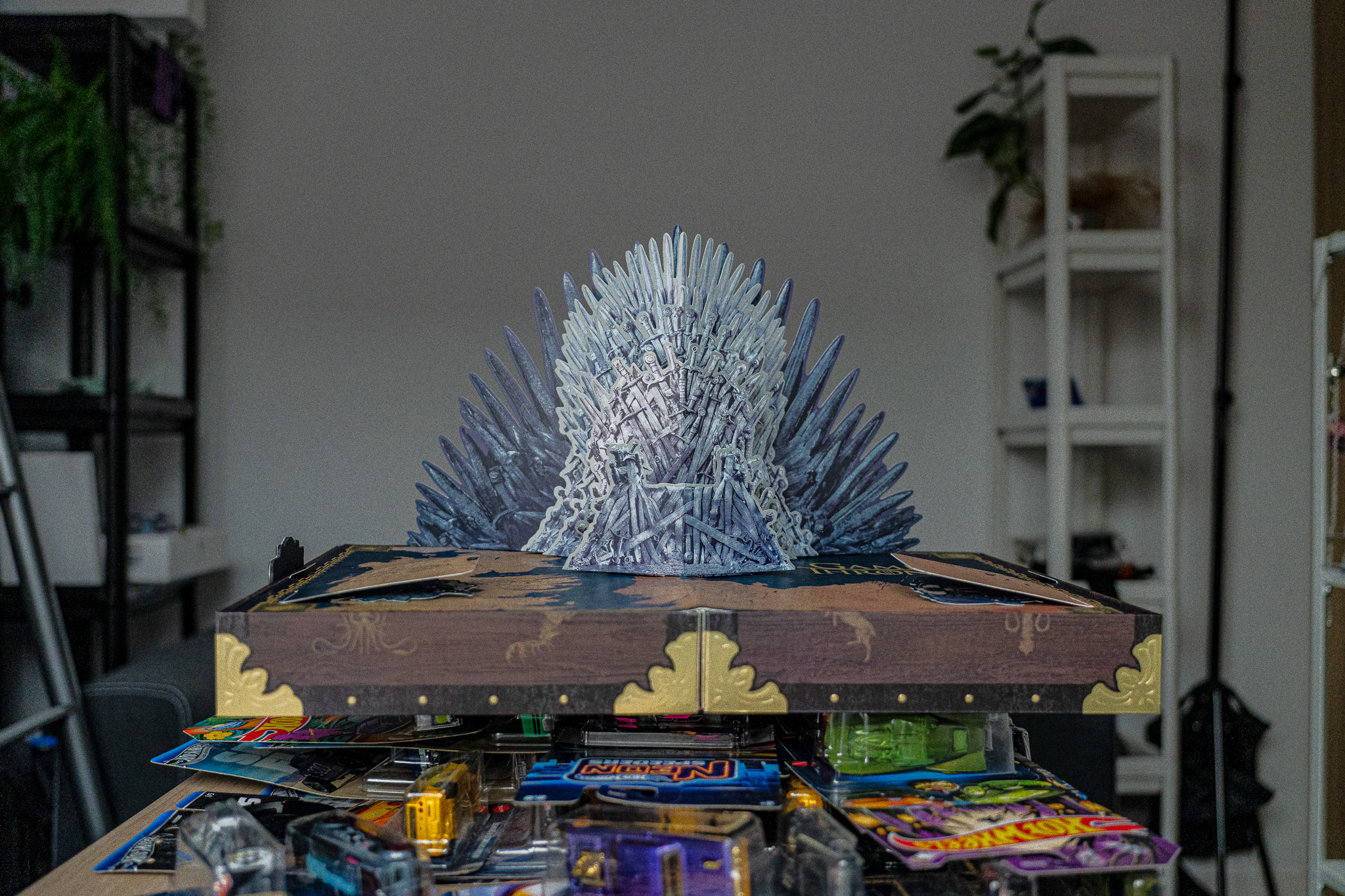 Już samo opakowanie zdradza, z jak niezwykłym produktem mamy do czynienia. Zamiast standardowego kartonu, otrzymujemy ciężką, pseudodrewnianą skrzynię z fakturą orzecha włoskiego i złotymi, rzeźbionymi zdobieniami, inspirowaną kufrem, w którym Daenerys Targaryen przechowywała swoje smocze jaja. Na wieku widnieje metalowa, trójwymiarowa nazwa serialu, a całość zdobią herby dziewięciu wielkich rodów Westeros.