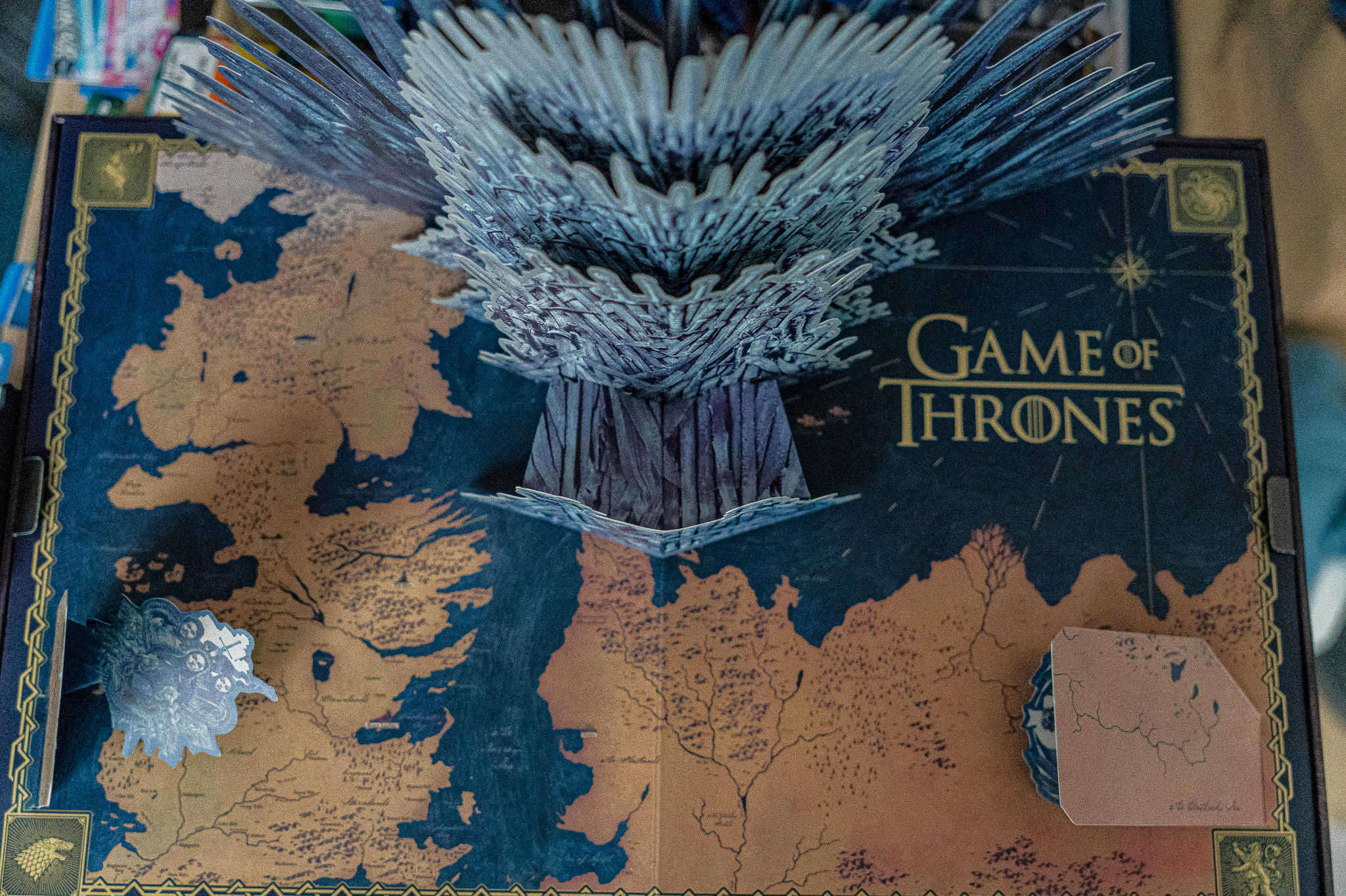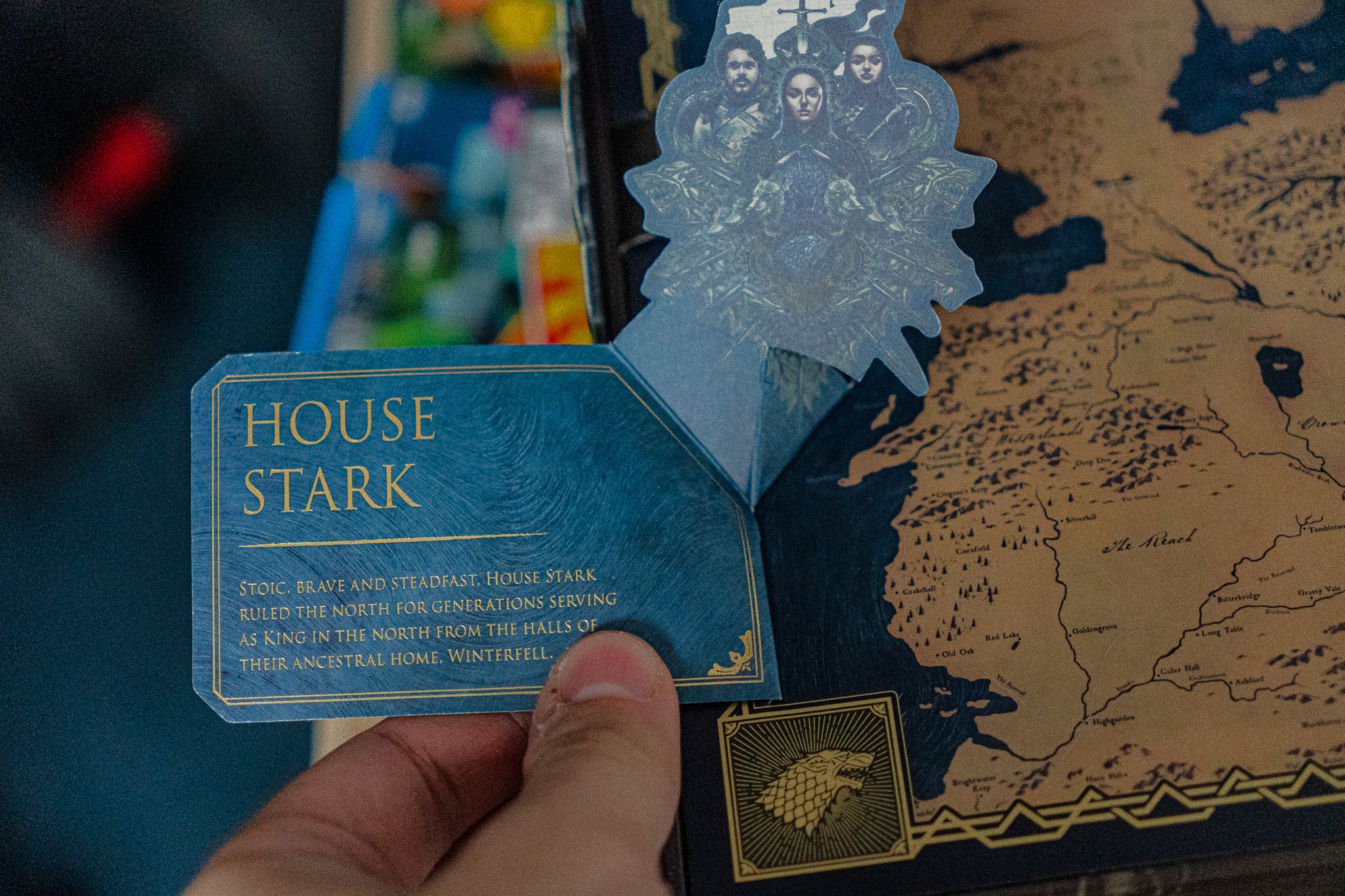 Po bokach znajdują się stylizowane wprowadzenia do historii rodów Starków i Targaryenów oraz misternie wykonana mapa Westeros.