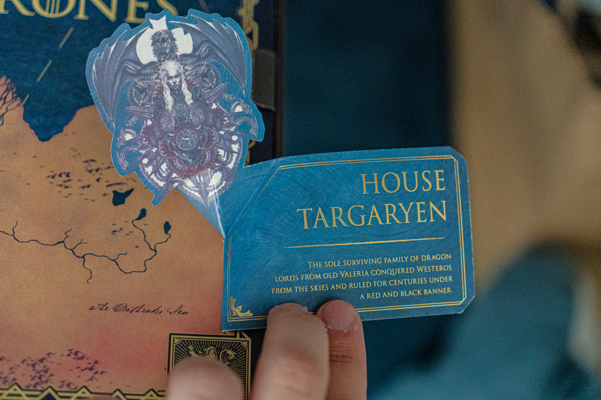 Pod główną częścią zestawu ukryto kolejne skarby. Pierwszym z nich jest metalowa przypinka Namiestnika Króla, inspirowana tą noszoną przez Tyriona Lannistera. Obok znajdziemy zestaw naklejek i pocztówek z herbami rodów.