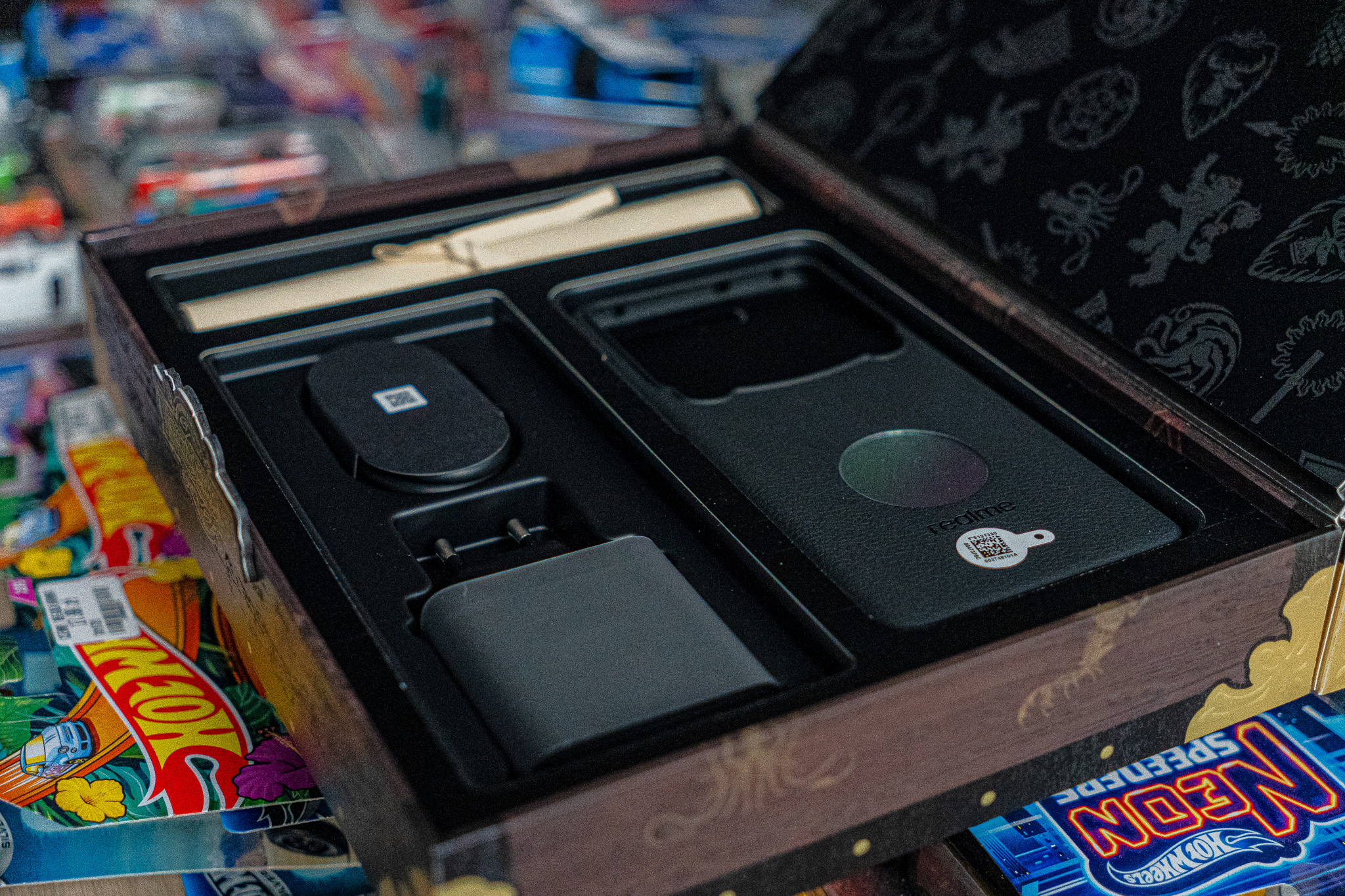 W zestawie znalazły się też standardowe akcesoria: ładowarka SuperVOOC o mocy 80 W, kabel USB-C oraz przewodowe słuchawki. choćby tutaj zadbano o detale – instrukcję obsługi oprawiono w okładkę stylizowaną na stary pergamin, a dołączone etui ochronne wykonano z transparentnego plastiku z wytłoczonym motywem smoczej łuski.