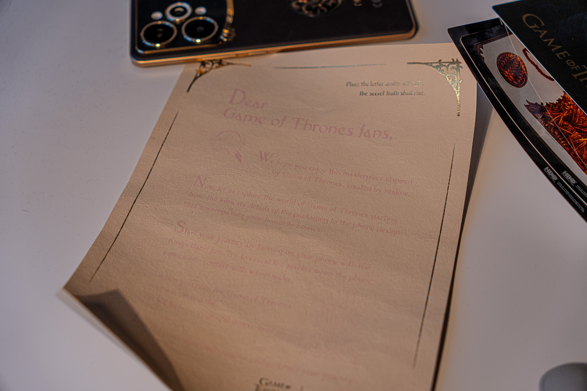Najciekawszym dodatkiem jest jednak tajemniczy, pusty list. To nawiązanie do magii ognia Melisandre – papier wykonano w technologii transformacji UV. Wystarczy wystawić go na działanie światła słonecznego, by na jego powierzchni pojawił się ukryty tekst.