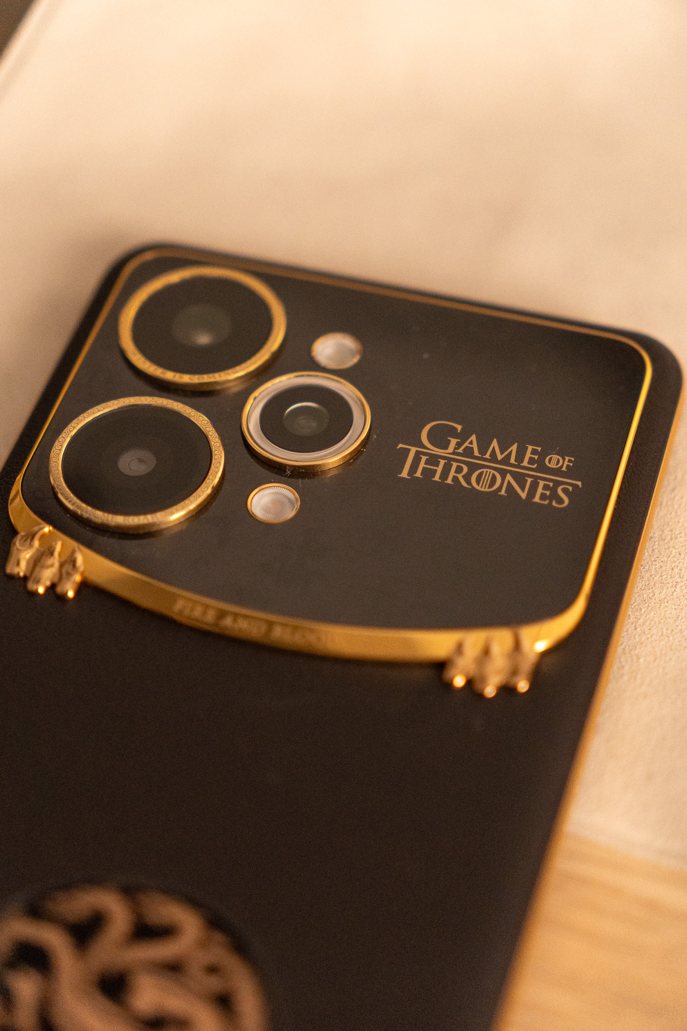 Tylny panel pokryto miękką, przyjemną w dotyku sztuczną skórą z fakturą inspirowaną smoczą łuską, na której wytłoczono trójwymiarowy, złoty herb rodu Targaryenów. Całość otacza płaska, złota ramka z aluminium, a smukła konstrukcja (zaledwie 7,84 mm grubości) sprawia, iż telefon świetnie leży w dłoni.