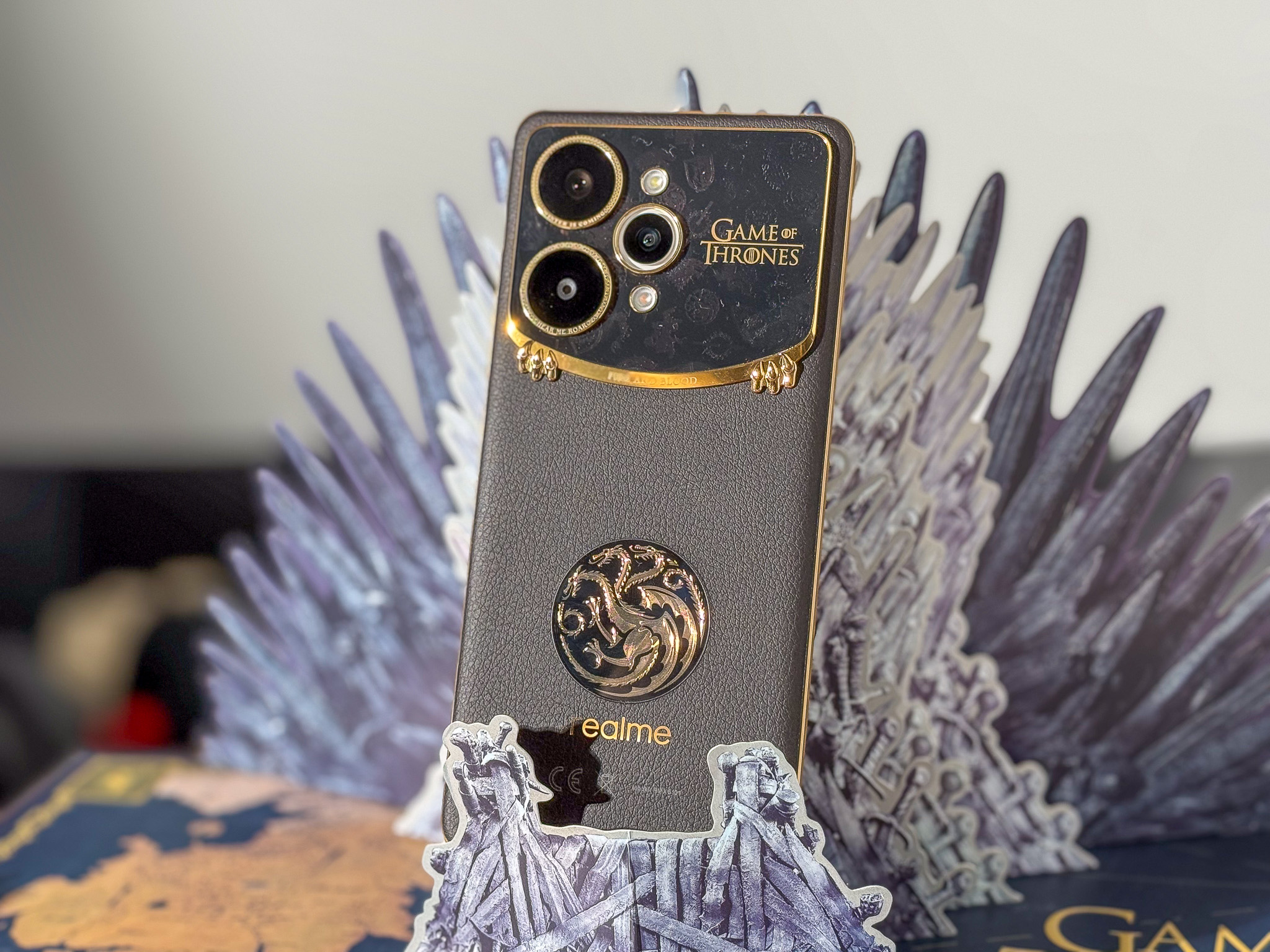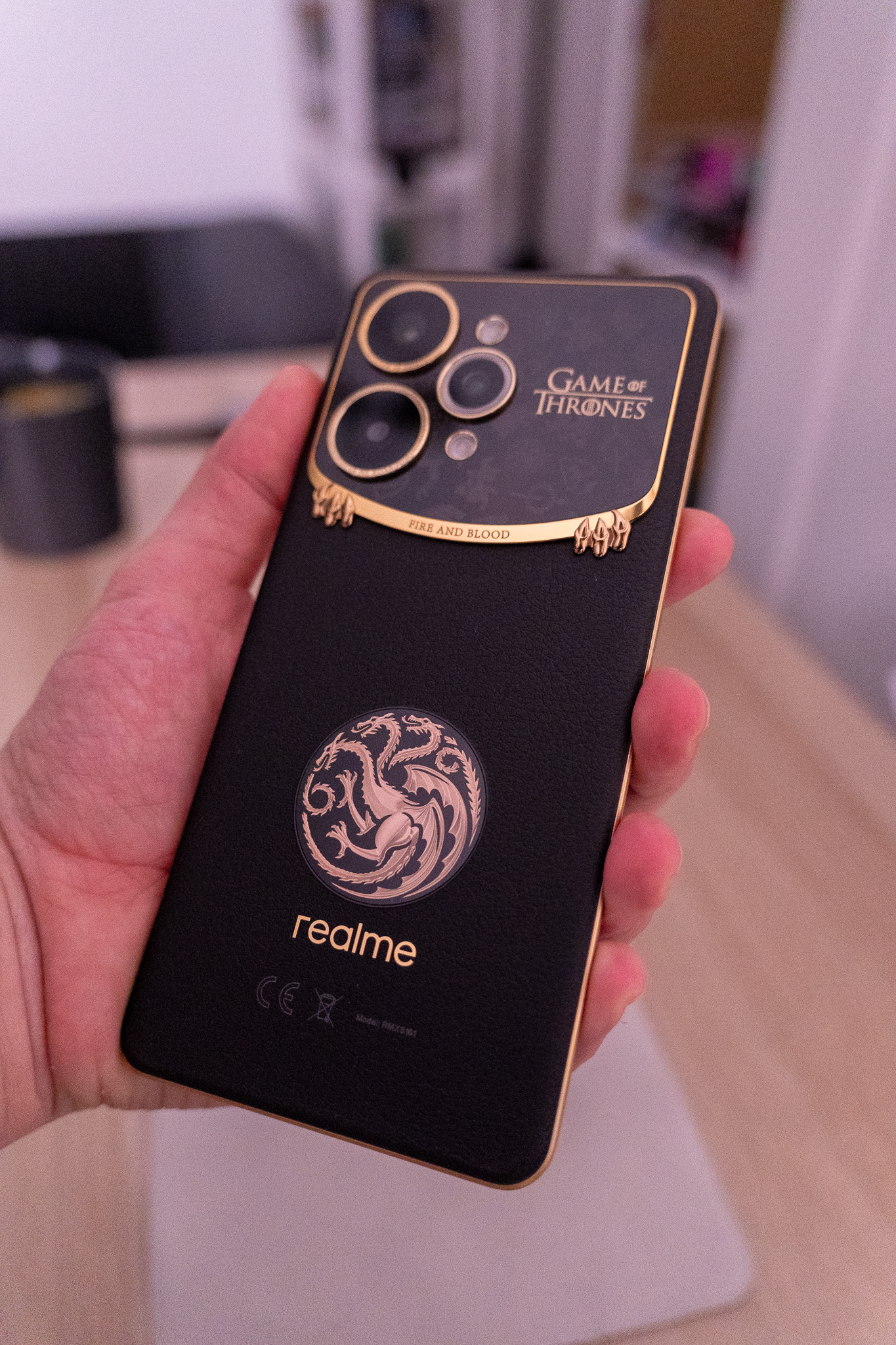 Smartfon realme 15 Pro w edycji GOT utrzymany jest w estetyce Golden-in-black, gdzie czerń smoczej skóry kontrastuje ze złotymi akcentami.