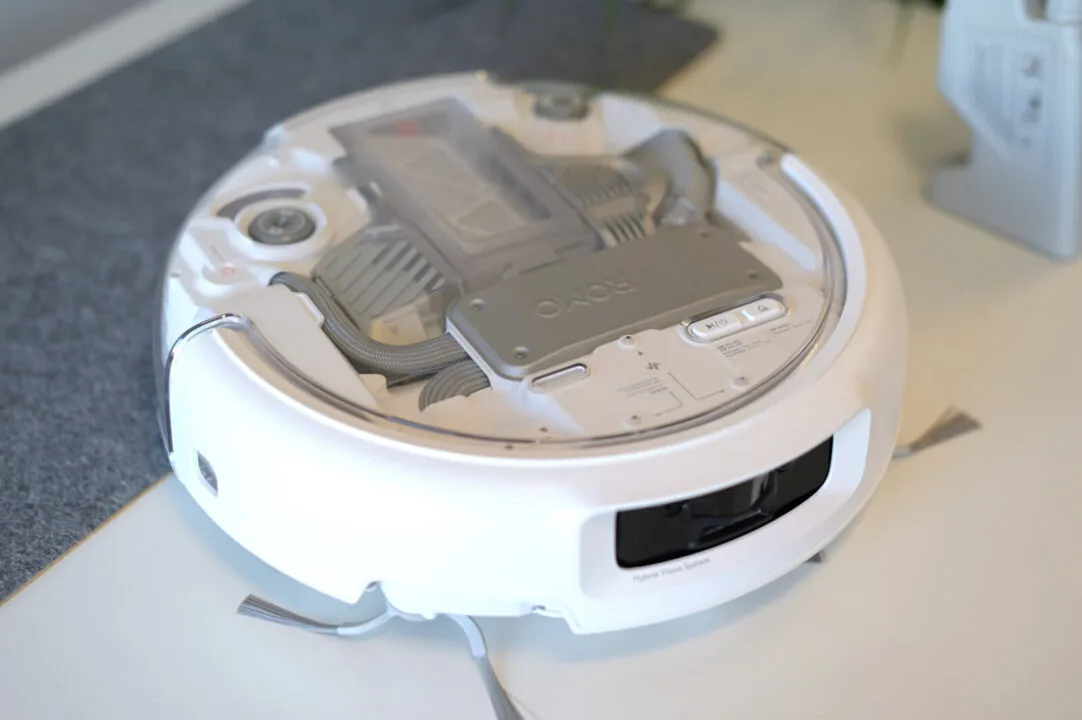 Od spodu jest klasycznie – dwa pady mopujące, podwójne szczotki odporne na wplątywanie się włosów, dwie szczotki zamiatające, duże gumowe koła i masa czujników. Podobnie, jak we flagowych modelach konkurencji, jedna z miotełek wysuwa się poza obrys urządzenia, aby dokładnie czyścić w narożnikach oraz przy krawędziach. To samo tyczy się pada mopującego.