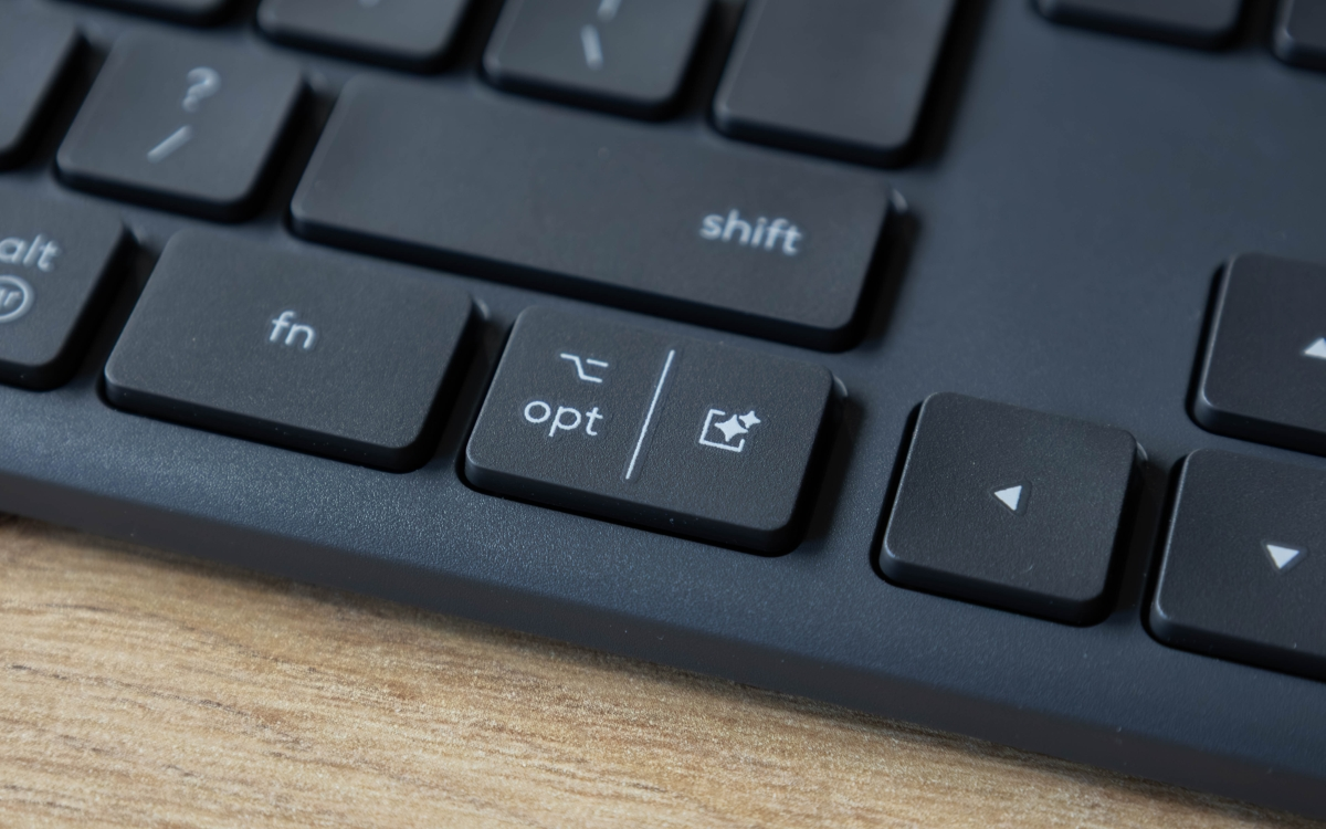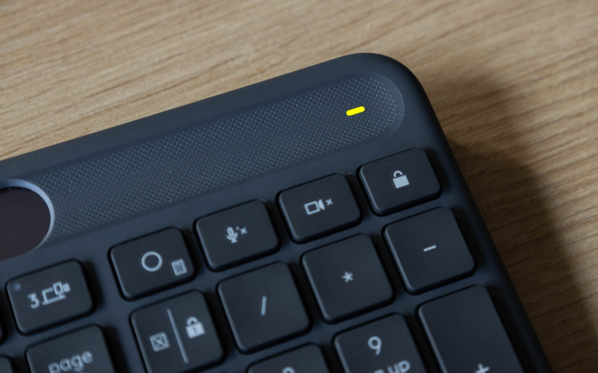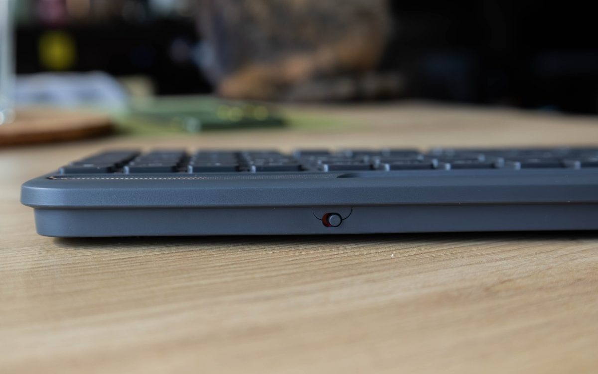 Z tyłu producent umieścił przełącznik zasilania, a u góry widać oczywiście wszystkie klawisze – ale nie tylko. Nad nimi widać bowiem pasek – w zasadzie panel fotowoltaiczny, który odpowiada za przechwytywanie przez sprzęt energii świetlnej. Oprócz bloku numerycznego i klasycznych przycisków funkcyjnych mamy tu klawisze Easy-Switch do łatwego przełączania się między urządzeniami i przycisk AI do uruchomiania asystenta Copilot lub innego..