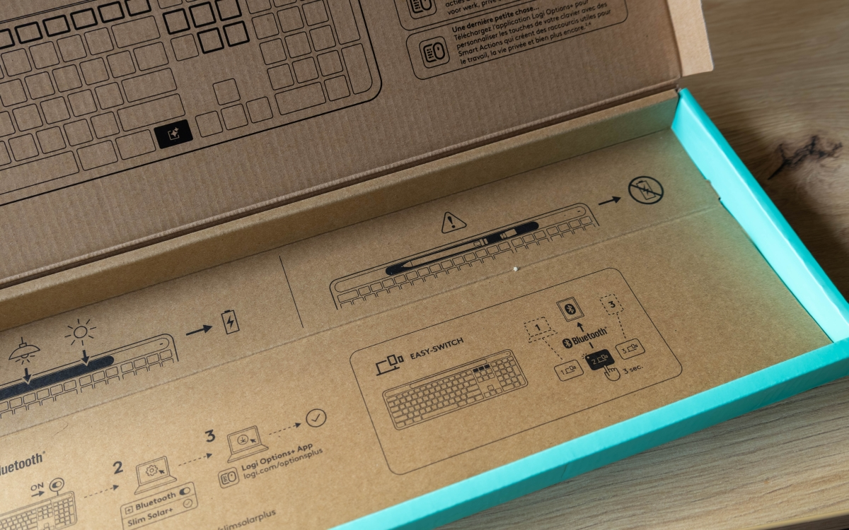Logitech Slim Solar+ K980 dotarła do mnie w bardzo skromnym zestawie, bo w opakowaniu znalazłam samą klawiaturę. O ile jednak brak kabla ładującego rozumiem ze względu na specyfikę urządzenia, tak szkoda, iż producent nie dodał do niego odbiornika Logi Bolt. Warto wspomnieć, iż instrukcja obsługi została nadrukowana na wnętrze pudełka – to po prostu jeden z przejawów ekologicznego podejścia realizowanego przez Logitech.