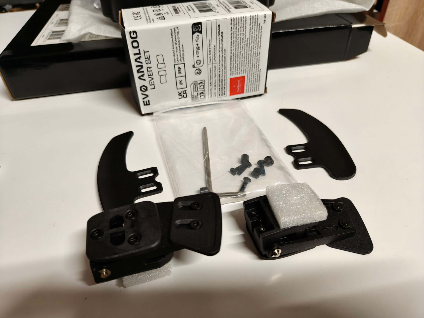 Zawartość opakowania obejmuje moduł dźwigni, manetki zmiany biegów oraz elementy montażowe. Instalacja zajmuje kilka minut i nie wymaga doświadczenia. Konstrukcja pasuje idealnie do EVO Racing Hub. Całość działa bez luzów, co zwiększa komfort jazdy.