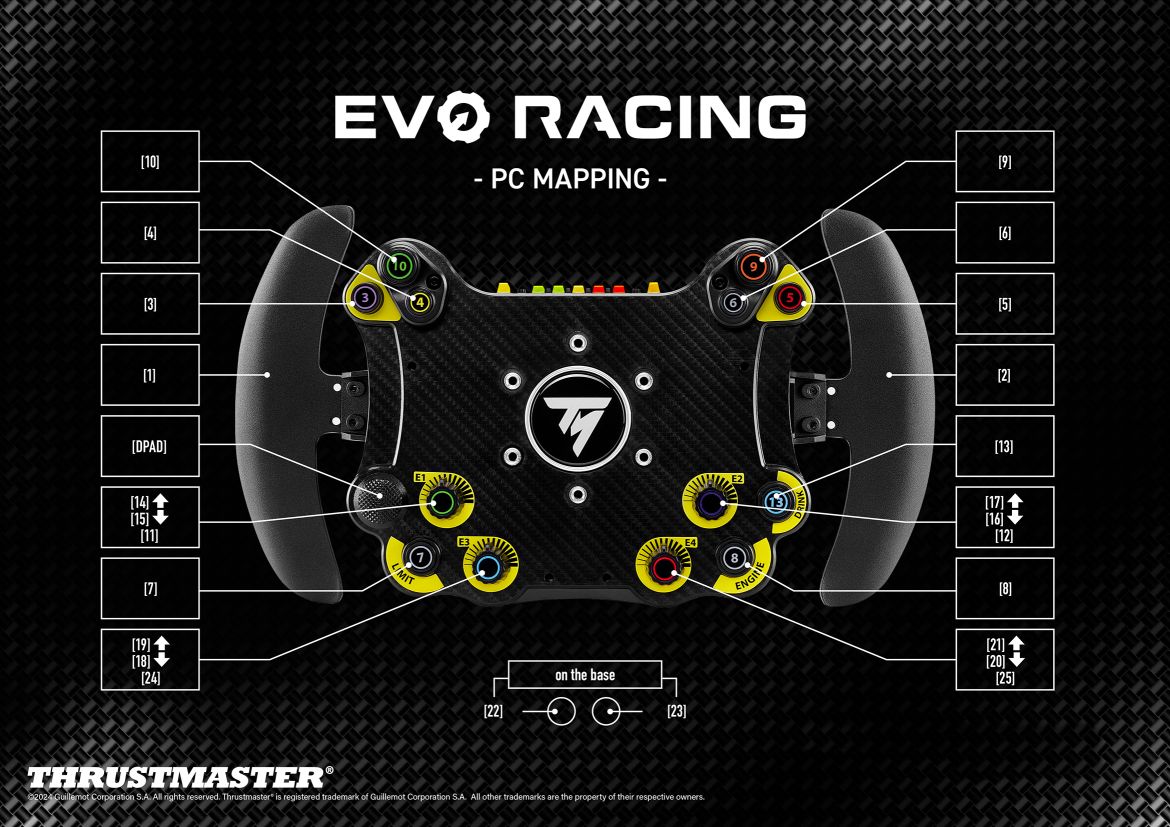 Konfiguracja w aplikacji My Thrustmaster Panel przebiega sprawnie. Użytkownik ustawia mapowanie przycisków oraz czułość wejść. Panel pozwala regulować siłę sprzężenia zwrotnego oraz zakres obrotu. Dodatkowo zapis ustawień działa gwałtownie i stabilnie. Interfejs pozostaje czytelny choćby dla początkujących. EVO Racing Hub działa ze wszystkimi konsolami PlayStation, Xbox oraz oczywiście PC. Klawiszologię możesz zobaczyć w poniższej galerii.