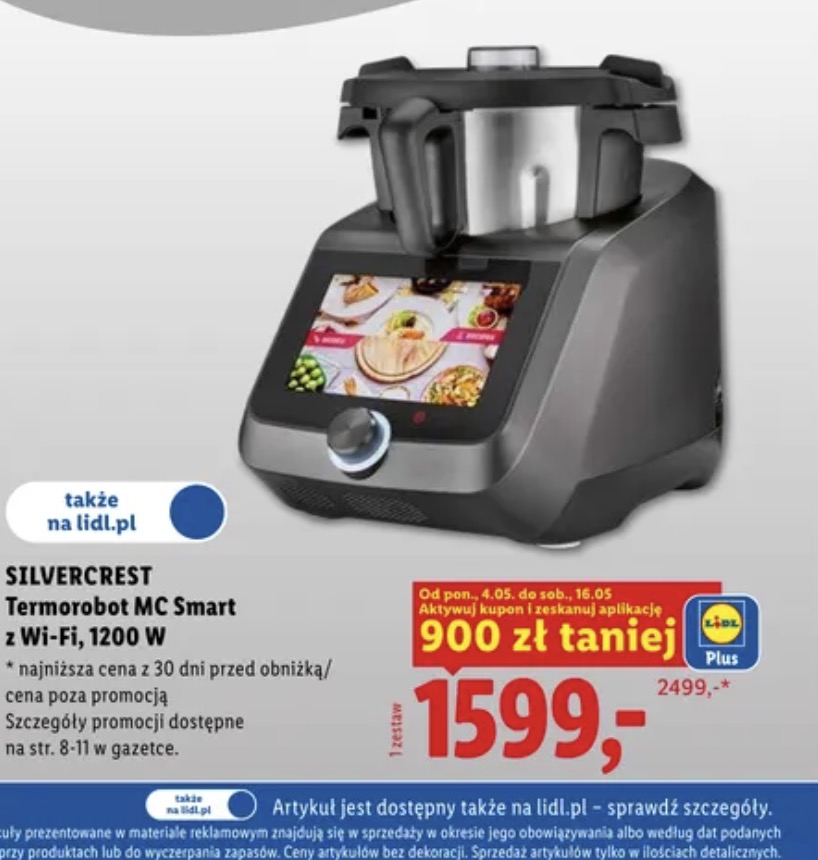 Z najnowszej gazetki Lidla dowiadujemy się, iż od poniedziałku 4 maja aż do soboty 16 maja 2026 r. robot kuchenny MC Smart WiFi będzie dostępny o 900 zł taniej. Po weekendzie majowym kupimy go za 1599 zł, co jest kapitalną ceną w przypadku tego sprzętu. Promocja ma być aktywna zarówno online, jak i