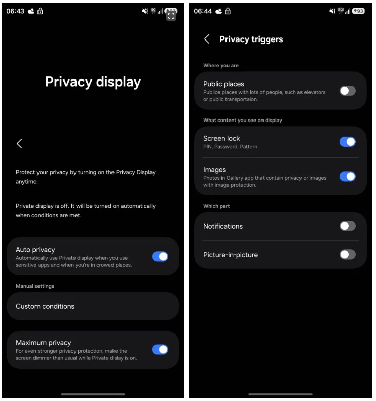 fot. 9to5GoogleNatomiast do sieci wyciekły dwa zrzuty ekranu ukazujące działanie nadchodzącej funkcji. Ta została nazwana prywatność ekranu (ang. privacy display) i obejmuje mnóstwo funkcji: