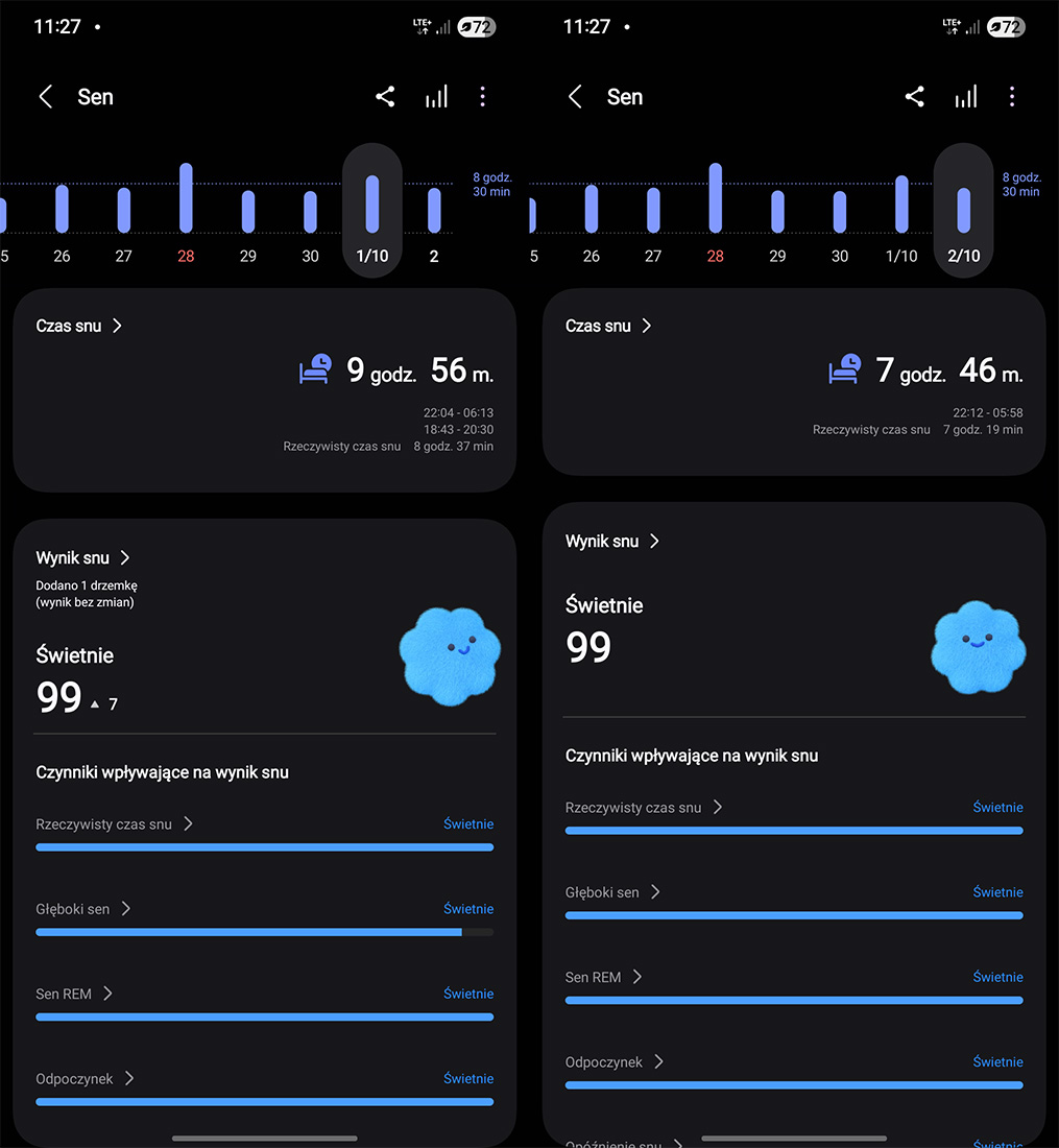 Normalnie przeszłabym obok całej sytuacji obojętnie i machnęła ręką gdyby nie fakt, iż mój własny wynik snu w ciągu ostatnich kilku dni nagle również skoczył do 99 z wynikiem „Świetnie” w każdej kategorii. Tak jakbym z dnia na dzień zaczęła spać snem sprawiedliwego.