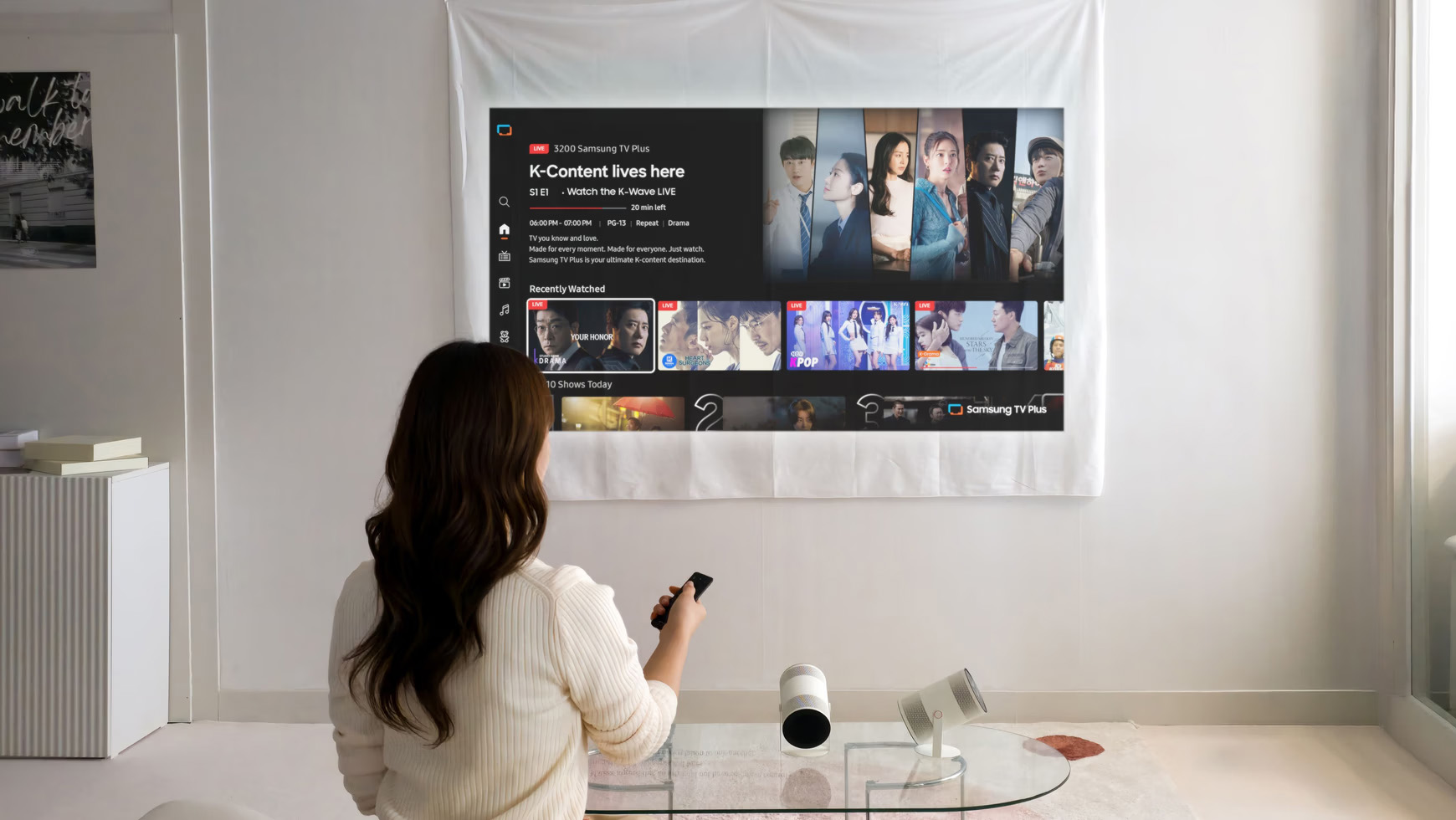 Przenośny projektor Freestyle+ to produkt, który mógłby być mało istotnym uzupełniaczem oferty. A jednak Samsung wykonał konkretną, mierzalną robotę: Freestyle+ ma 430 ISO lumenów, co oznacza prawie dwukrotny wzrost jasności wobec poprzedniej generacji mierzącej 230 lumenów. AI OptiScreen automatycznie koryguje trapez obrazu (3D Auto Keystone) choćby przy projekcji na nierówne lub zakrzywione powierzchnie, w czasie rzeczywistym. Brzmi jak techniczne bajki – ale demonstracje pokazywały projektor wymierzony w zasłony czy narożnik ściany, który błyskawicznie wyprostowuje obraz.