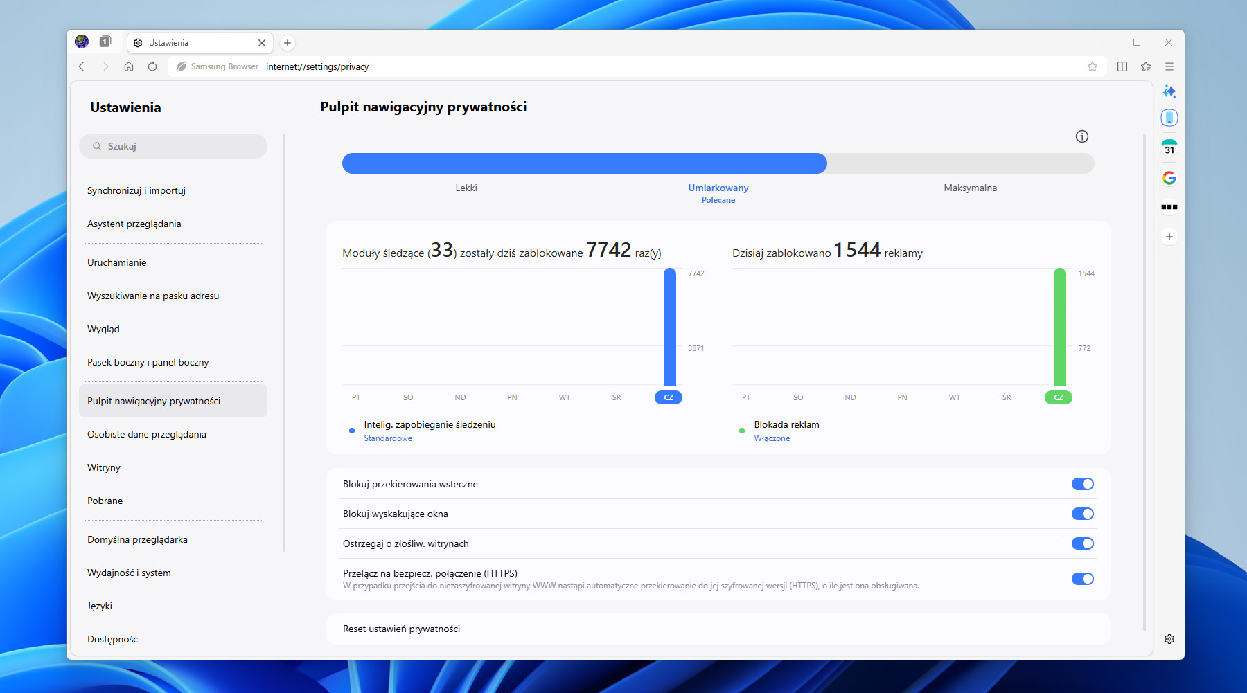 Samsung Browser posiada również wbudowany bloker reklam, który jest efektywny w przeciwdziałaniu typowym, irytującym reklamom na stronach z treściami tekstowymi, ale nieefektywny w starciu z YouTubem. Oprócz tego przeglądarka oferuje kilka funkcji zwiększających prywatność, w tym m.in. inteligentne zapobieganie śledzeniu, blokowanie przekierowań wstecznych czy blokadę wyskakujących okien.