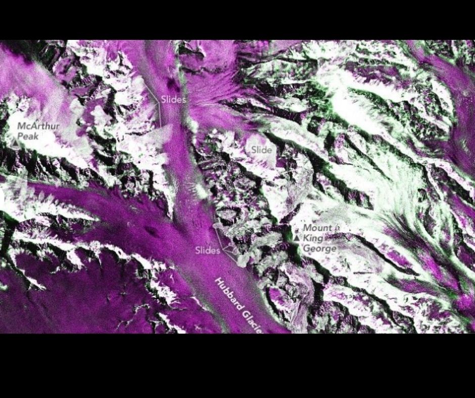 Na obrazach radarowych szczególnie rzuca się w oczy jeden wielki jęzor osuwiska schodzący ze zboczy góry Mount King George. Wygląda, jakby ktoś jednym ruchem pociągnął gigantycznym pędzlem z kamieni i śniegu po białej powierzchni lodowca.