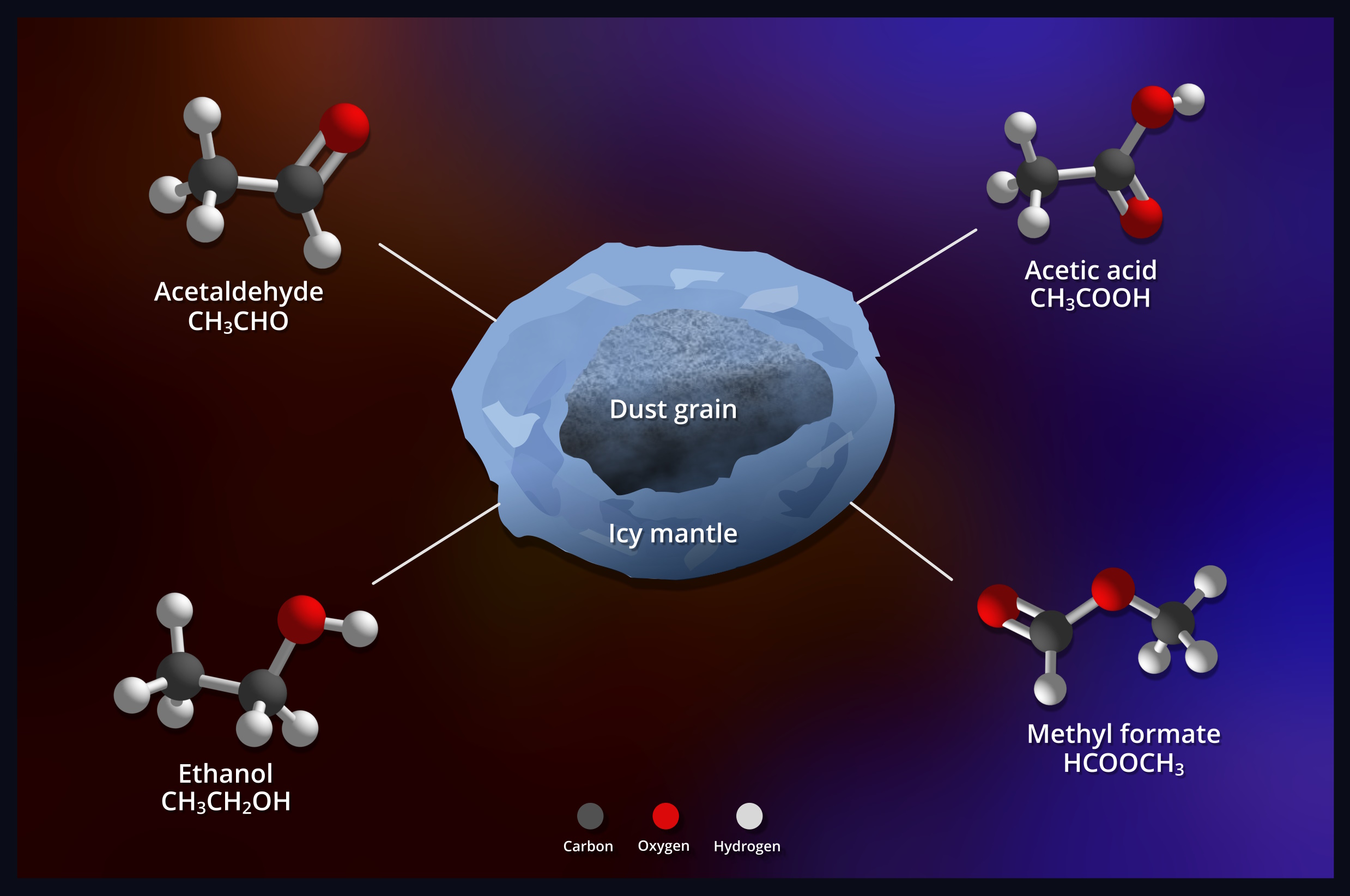 Diagram przedstawiający związki chemiczne wykryte na lodowych ziarnach pyłu wokół ST6: aldehyd octowy, kwas octowy, etanol i mrówczan metylu. Ilustracja: Centrum Lotów Kosmicznych im. Goddarda NASA.Kosmiczne chemiczne puzzle