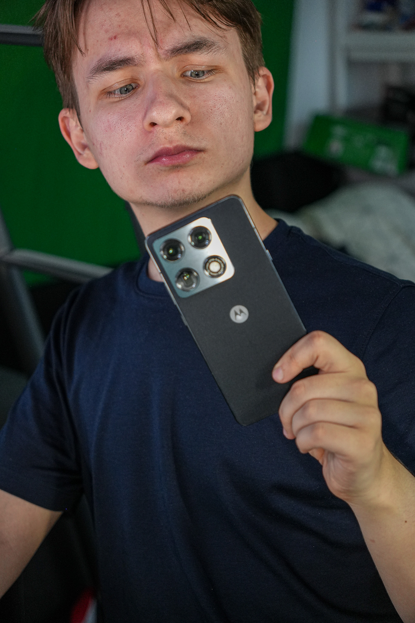Zauważyłem jednak u niego specyficzny syndrom sobowtóra. Wyspa aparatów płynnie przechodzi w obudowę, a warianty wykończenia (Martini Olive, zieleń i Carbon, czarny) przypominają w dotyku gęstą tkaninę. Wizualnie nawiązuje to jednak zbyt mocno do znacznie tańszych modeli z serii Edge, chociażby Edge 50 Neo.