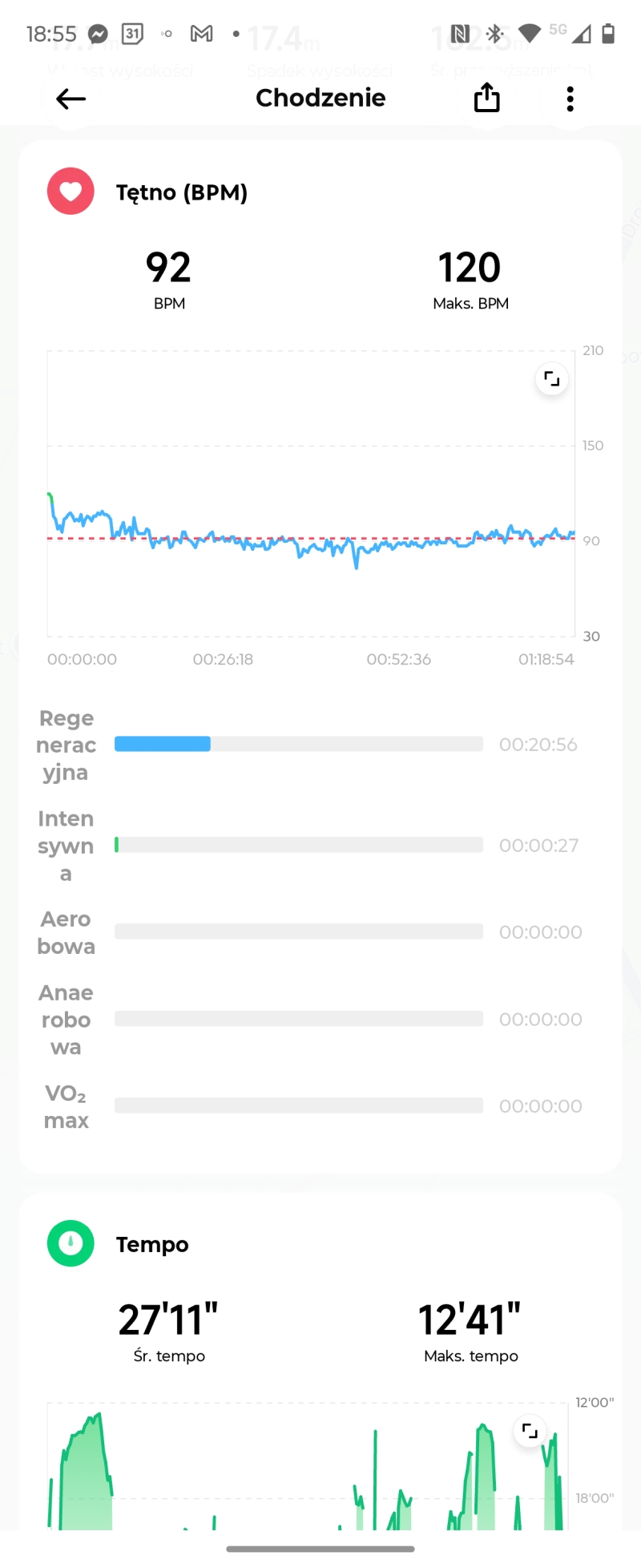 Po zakończeniu treningu jego podsumowanie możemy zobaczyć zarówno na zegarku, jak i w aplikacji na telefonie. I tu i tu dane nie są przedstawione w sposób surowy, a schludnie i z dodatkiem wykresów. Przyjemnie się na to wszystko patrzy i śledzi swoje postępy.