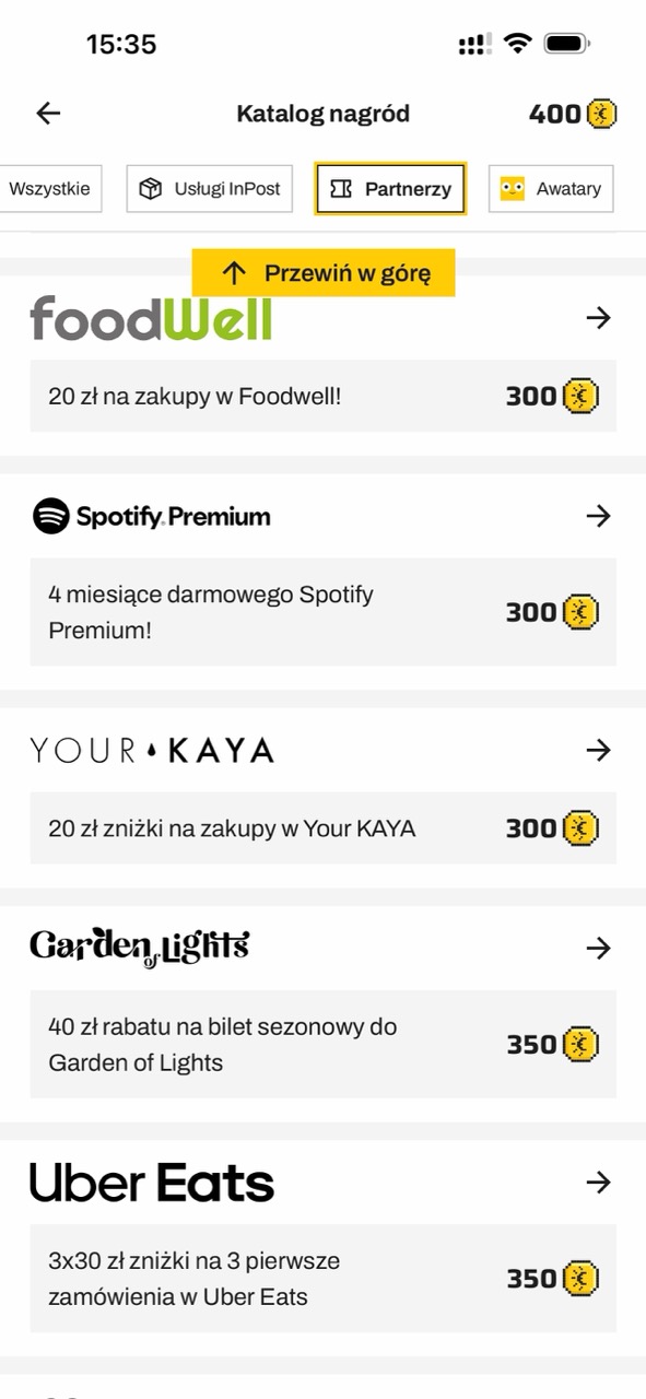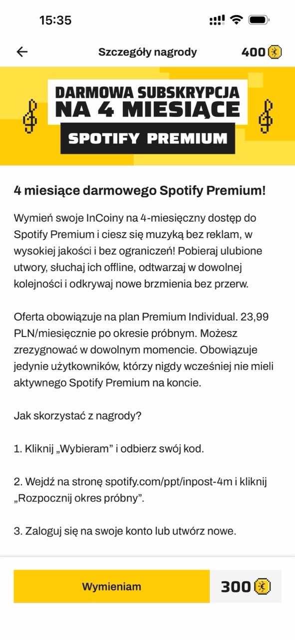 - wejść do aplikacji InPost > Nagrody > Katalog Nagród > Partnerzy i zjechać na dół do ofert za 300 punktów (Spotify Premium będzie na pierwszym miejscu);